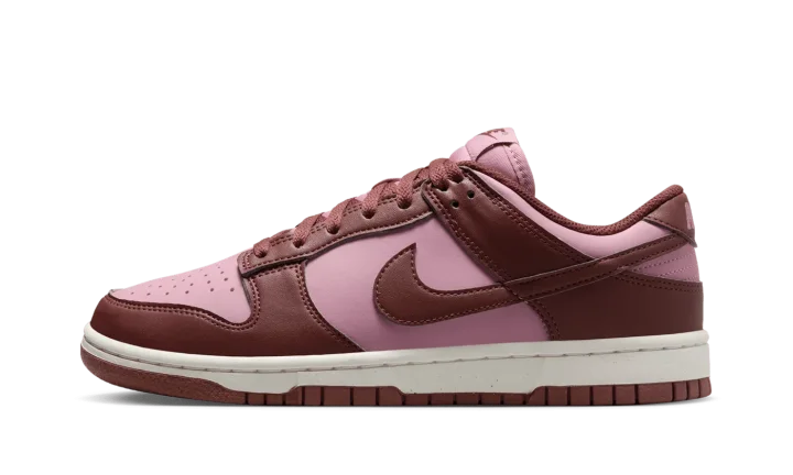 The Nike Women's Dunk Low Next Nature 'Dark Pony Elemental Pink' features a vibrant pink base with reddish-brown overlays and a color-matched Swoosh.