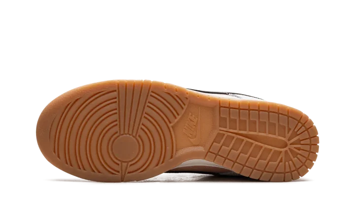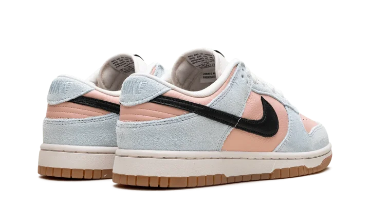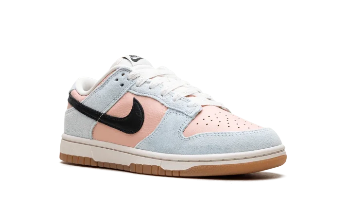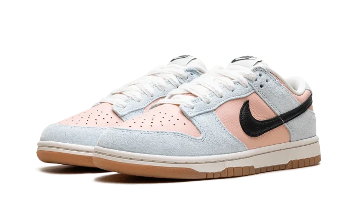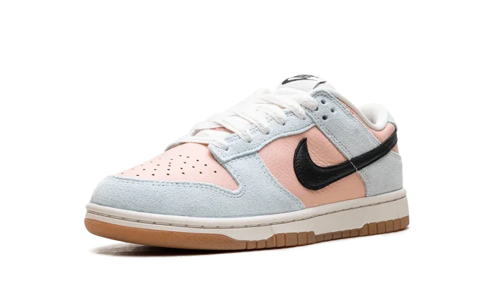 The Nike Women's Dunk Low 'Glacier Blue Arctic Orange' showcases a solid black leather Swoosh on the upper, which is crafted from pink tumbled leather with suede overlays in a light blue hue.
