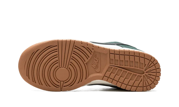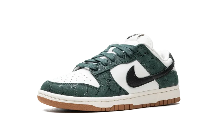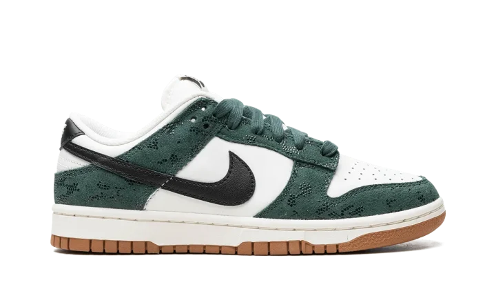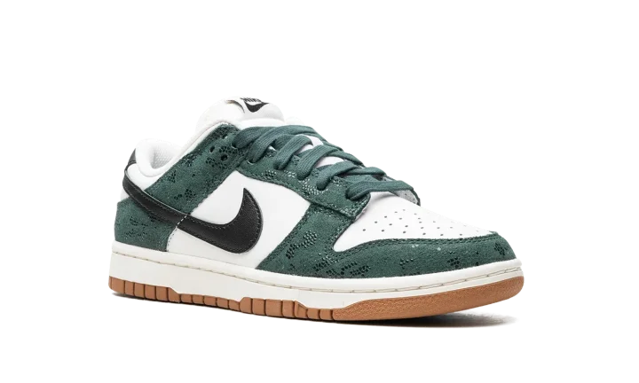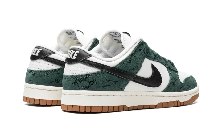 The Women's Nike Dunk Low "Green Snake" is a women's-exclusive colorway of the retro basketball shoe with reptilian accenting. The "Green Snake" features a unique combination of smooth and textured panels, the latter of which are arranged in a scale-like texture on the shoe's overlays. The upper is complete with a white leather base and Pro Green overlays with the reptilian pattern. A black leather Swoosh appears on each side. "Nike" is embroidered on the heel and printed on the tongue tag with a Swoosh. Release date: October 17, 2023