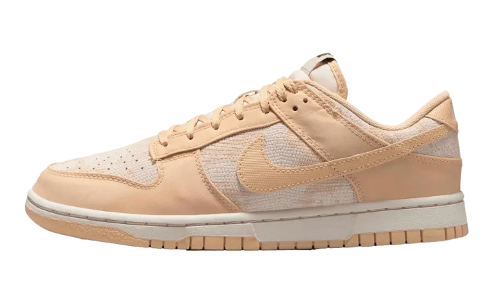 The Nike Women's Dunk Low 'Light Orewood Snakeskin' brings a subtle snakeskin texture on the suede upper, finished in a muted peach hue and reinforced with tonal textile overlays at the forefoot and heel.