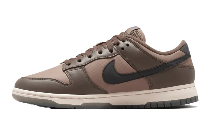 The Nike Women's Dunk Low 'Mink Brown' showcases varying shades of brown on an upper crafted from ripstop textile with smooth leather overlays at the forefoot and heel. Anthracite accents land on the signature Swoosh and back tab, debossed with a Nike wordmark in royal blue lettering.