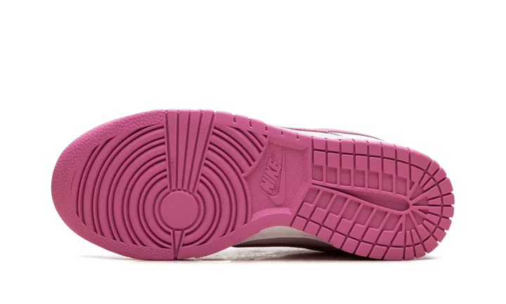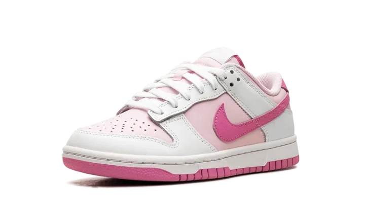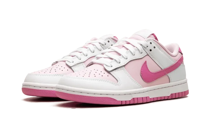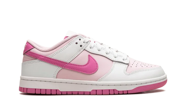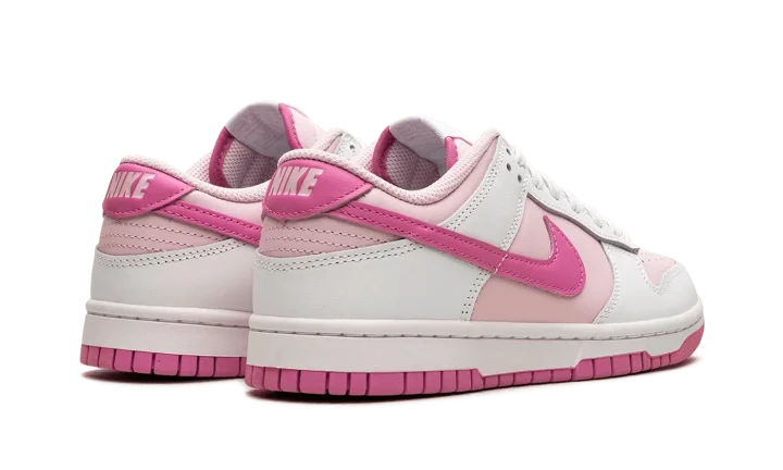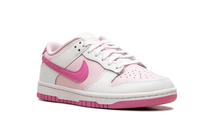 The Nike Dunk Low Pink Foam (Women's), available in women's sizes, is a low-top basketball-style sneaker featuring a leather upper in Pink Foam with White Overlays. The Swoosh and heel tab accent the colorway in Playful Pink and coordinate with the tongue accent and outsole.