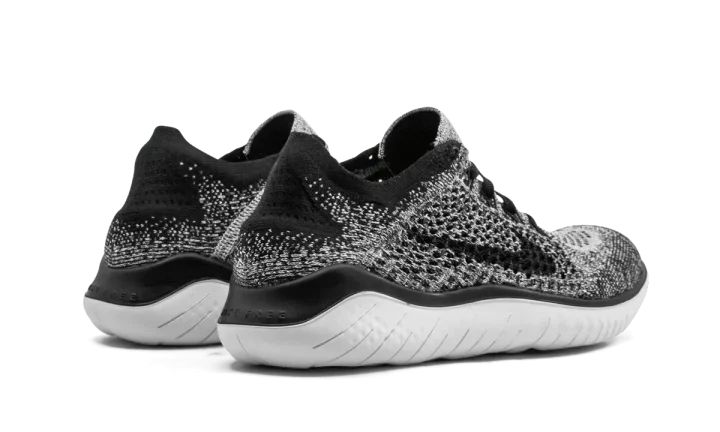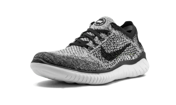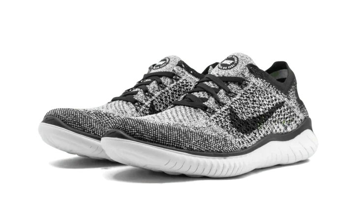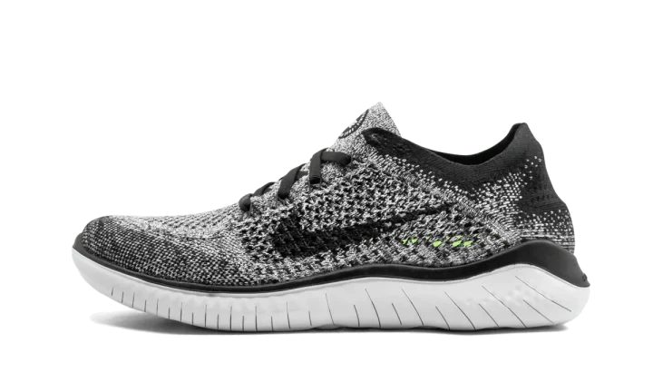 The women's Nike Free RN Flyknit 2018 is one of the premier running shoes from the Swoosh. A Flyknit upper provides a lightweight, sock-like fit. Reinforced areas are placed at the toe and heel for additional durability. A Free Run sole provides additional flexibility. This colorway features a black-and-white upper, a black Swoosh on each side panel, and a neon green insole. A white midsole completes the "Oreo" colorway.