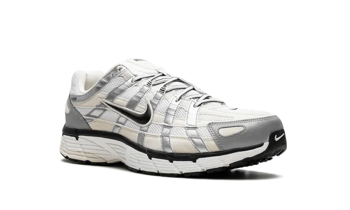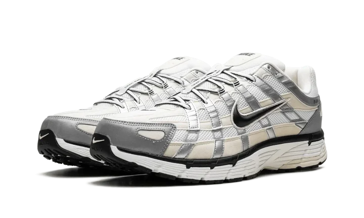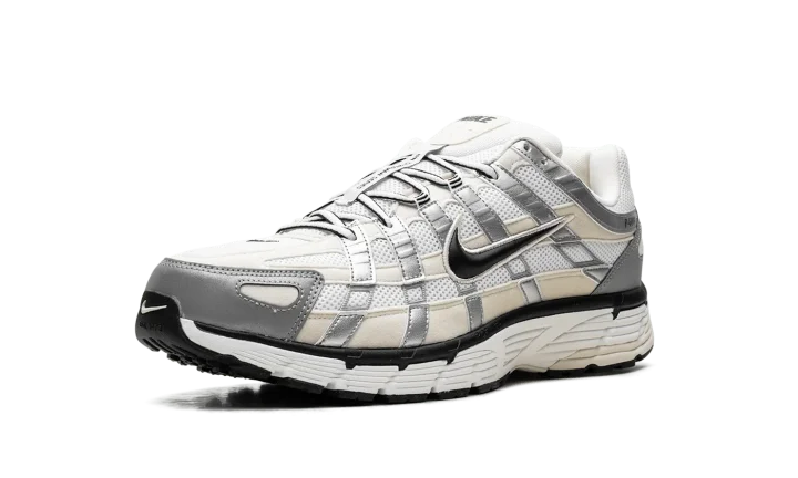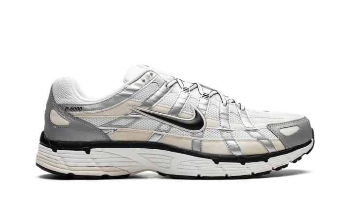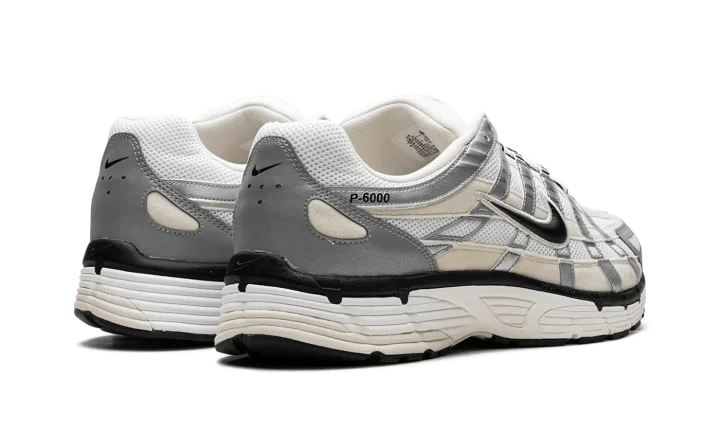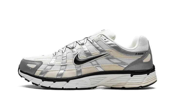 The Nike P-6000 "Coconut Milk" is a versatile colorway of the shoe inspired by the Nike Pegasus 25 and 2006. Inspired by the 2000s era of running shoes, the P-6000 has a retro-meets-modern appearance that lends itself to casual wear in today's sneaker landscape. The shoe's design features a light grey mesh base with tonal and white leather overlays. A black Swoosh logo is located on either side of the shoe. An open white mesh base with Coconut Milk and Metallic Silver overlays, as well as reflective silver panels at the toe and heel, complete the design.