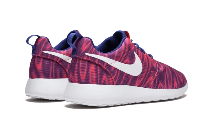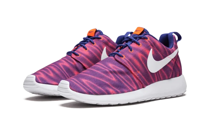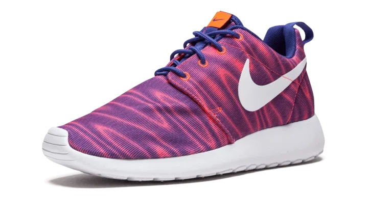 The Nike Roshe One women's shoe is a major step up from a plain set of sneakers. This catchy silhouette has a blueish-purple and orange psychedelic graphic pattern and is complemented by a solid white side Swoosh and outsole. The same vibrant colors are employed on the laces, inner lining, and tongue tag. A Solarsoft sockliner and a cushioned Phylon midsole make the Nike Roshe One perfect for all-day wear.