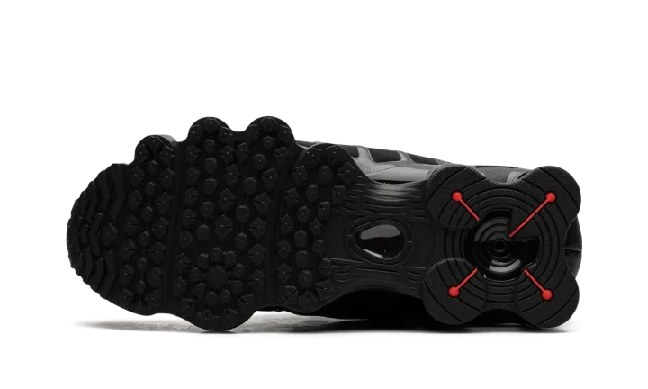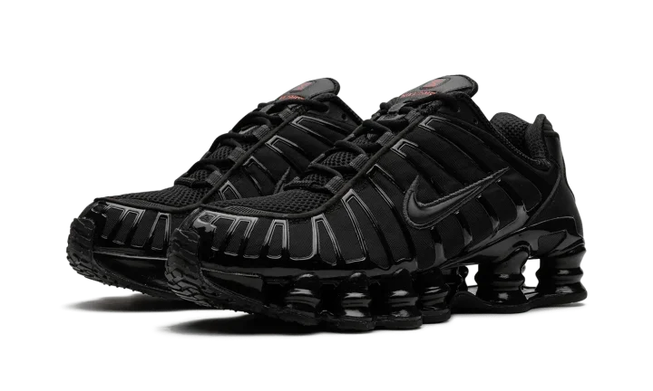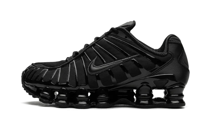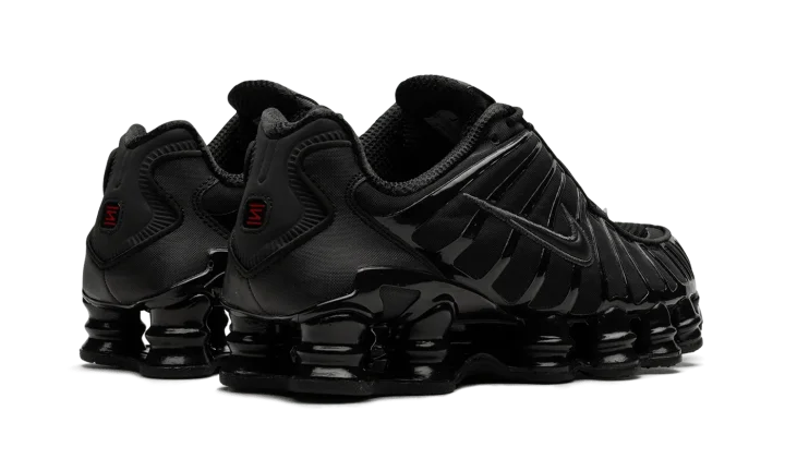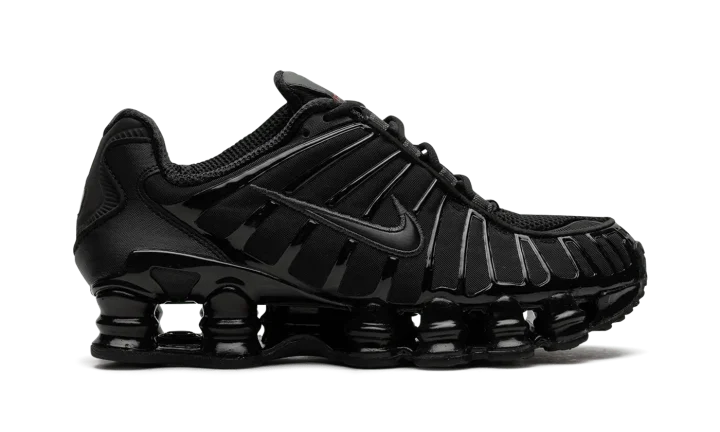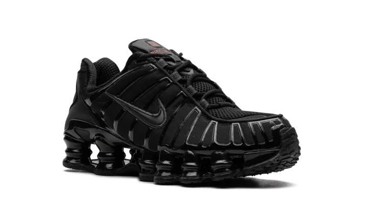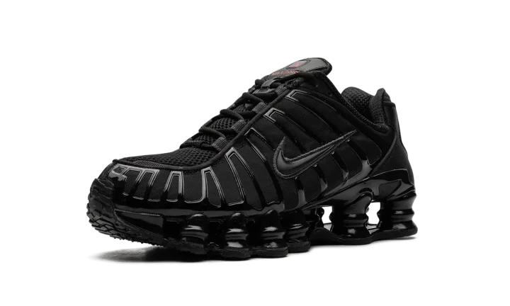 The Women's Nike Shox TL "Black" is a women's-exclusive colorway of the retro sneaker with a mostly monochromatic black appearance. The shoe's design features a black fabric construction with tonal TPU overlays. A black patent leather Swoosh logo appears on either side of the shoe. Red "Nike Shox" branding is seen on the tongue. The Shox TL's signature piston-shaped columns underfoot provide both a comfortable and responsive ride, as well as a vintage, Y2K-era flair. Release date: July 25, 2023
