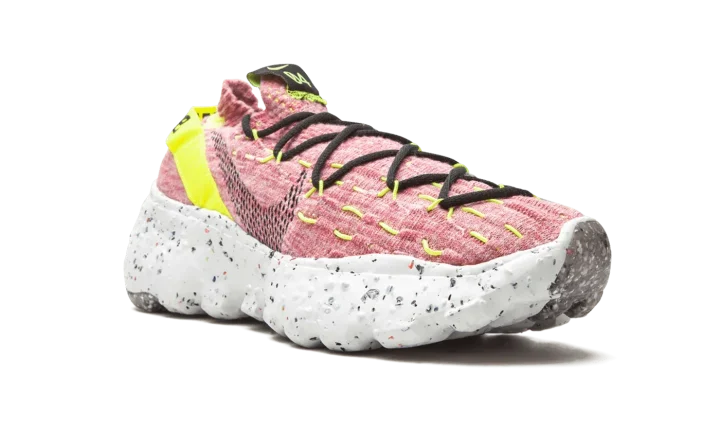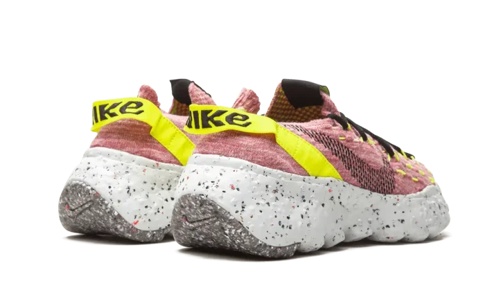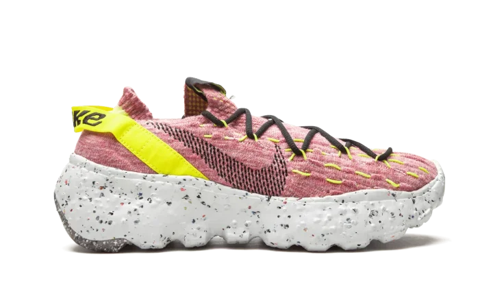 The Women's Nike Space Hippie 04 "Lemon Venom" is a women's exclusive colorway of the sustainable shoe from Nike's "Space Hippie" campaign. The forward-thinking collection is centered around the idea of living on Mars with few resupply missions. Each model in Nike's "Space Hippie" line is built from "space junk," otherwise known as leftover materials from Nike's cutting room floor. The recycled scraps form the pink and grey woven upper and speckled FoamX midsole. A black dotted Swoosh appears on the mid-panel and futuristic "Nike" text graces the Lemon Venom nylon heel tab. Despite its sock-like appearance, a traditional lacing system can be found on the top of the shoe and provides the wearer with even more stability. Nike rounds out the look of the Space Hippie 04 by placing "space junk" within the foam outsole. Release date: August 20, 2020.