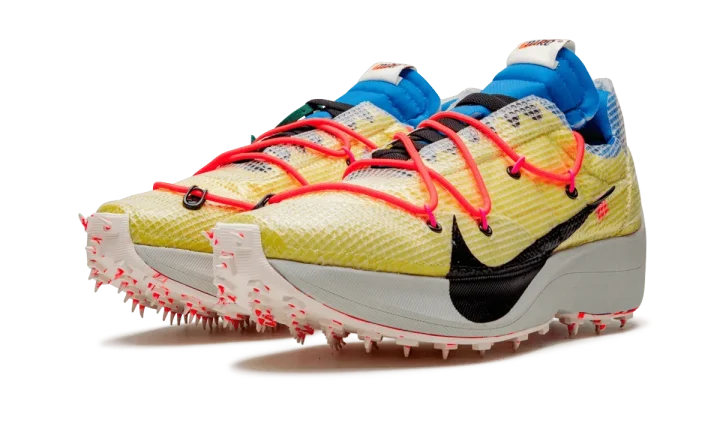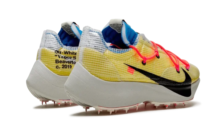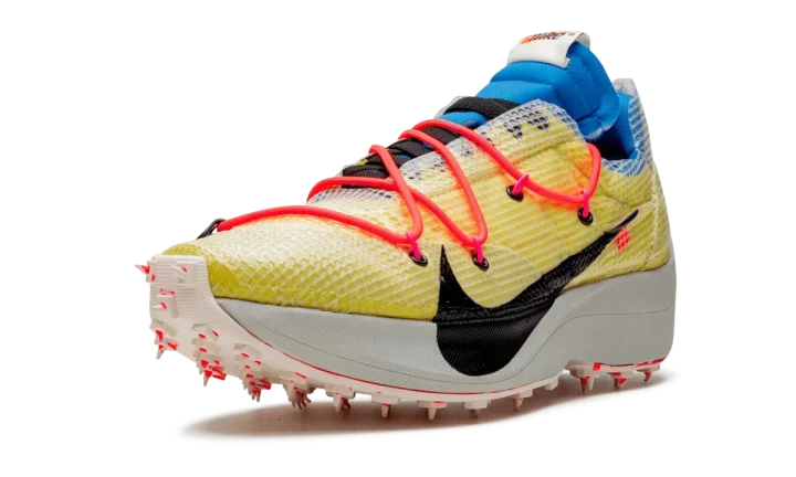 The Off-White x Nike Zoom Vapor Street "Tour Yellow" fuses Nike's sleek VaporFly and Zoom Fly for a futuristic aesthetic. Virgil Abloh, the designer behind the hybrid model, combines elements of the classic '70s-era runners with contemporary footwear technology. Those familiar with Abloh's work with Nike can find welcoming detailing that includes a staggered lacing system and an oversized black Swoosh that covers the upper and dips down to the midsole. A thin foam padded blue tongue contrasts the semi-translucent Tour Yellow upper. Abloh's signature plastic hang tag is clipped onto the right shoe with performance-leaning rubberized track spikes on the outsole finishing off the ultra lightweight design. Release date: November 14, 2019.