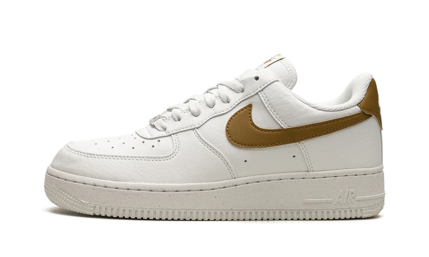 The Women's Nike Air Force 1 Low Next Nature "Bronzine" is a women's-exclusive colorway of the retro basketball shoe made from eco-friendly materials. Composed of at least 20% recycled content by weight, the Air Force 1 Low Next Nature is both sustainable and timeless in design. The "Bronzino" colorway has a white leather upper with tonal leather overlays and a gold, or Bronzino-colored leather Swoosh. More Bronzino detailing is featured on the leather heel tab and on the "Nike Air Force 1" branding on the tongue. Underfoot, a white rubber Nike Grind midsole made from recycled content completes the look. Release date: May 20, 2023