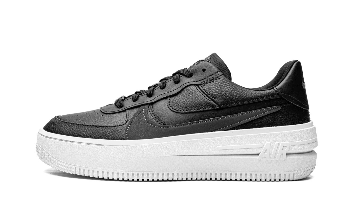 The Women's Nike Air Force 1 PLT.AF.ORM "Black" is an alternate, women's-exclusive version of the classic sneaker that elevates its silhouette with a platform-style sole and other modifications. The Air Force 1 PLT.AF.ORM features a contemporary appearance that progresses the retro basketball shoe's timeless design. The "Black" colorway features a black leather construction with an oversized tonal leather Swoosh layered over a cut-out Swoosh on either side. "Nike Air" and Swoosh logos are found on the heel and on the tongue. An oversized white rubber midsole that splits on the heel, giving the shoe a platform-style design.