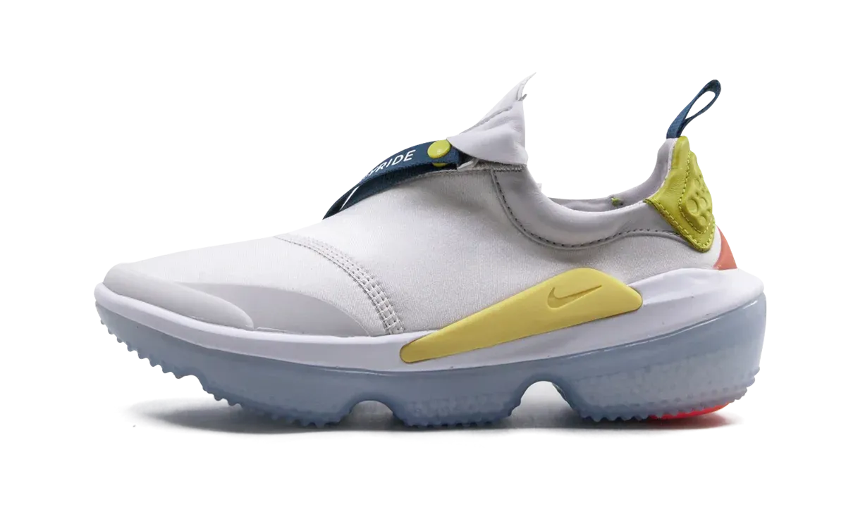 The Nike Joyride Optik Women's shoe is a comfort-oriented silhouette that offers a lot of style. The sleek silhouette is done primarily in white and light grey and then paired with fun color accents in citron, yellow, and forest green. The asymmetrical zip closure feels snug against the foot and bears the shoe's style name written in white font. The upper rests on an icy blue translucent rubber footbed. The Joyride Optik treats feet to a new world of cozy with a soft cushioning unit comprised of innovative bead-pods.