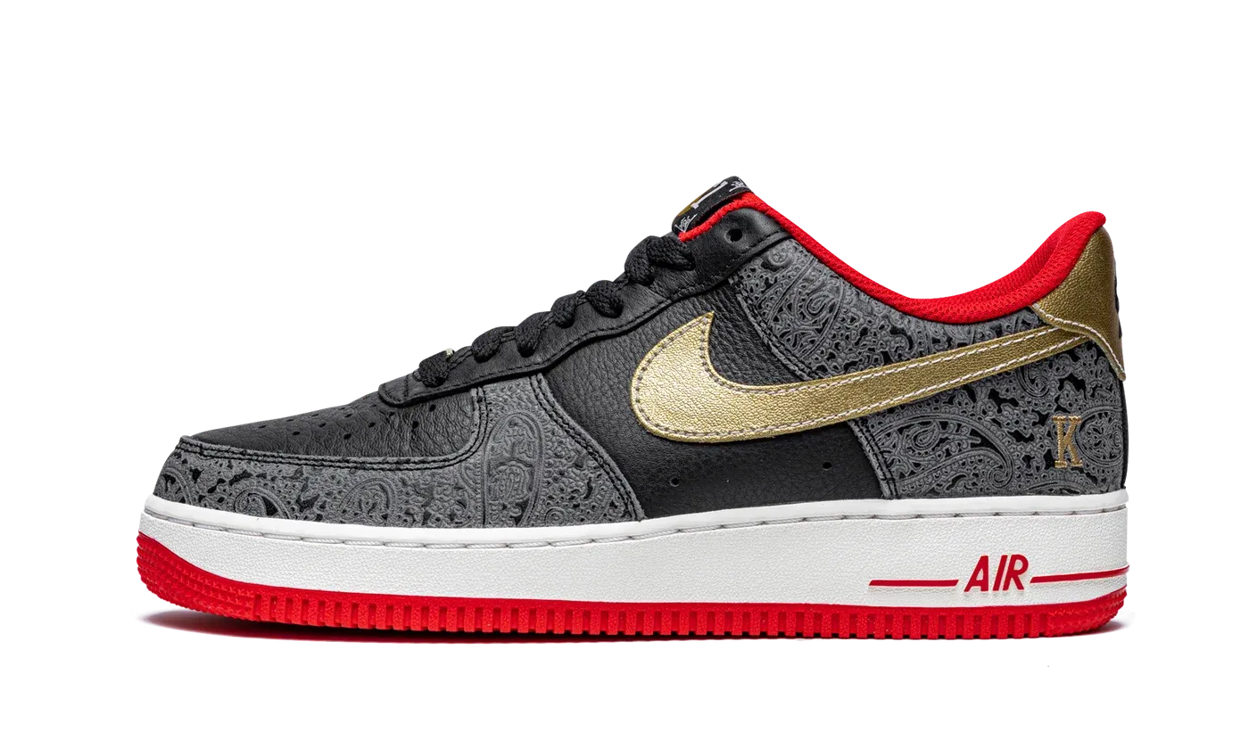 The Nike Air Force 1 Low '07 LX "Spades" is one of several legendary footwear models by Nike and Jordan Brand to be cast in a colorway inspired by playing cards for Spring 2021. Joining the Air Jordan 1 Low SE "Spades," the Air Force 1 of the same nickname features a luxury influence with a paisley pattern inspired by the background on a playing card on the forefoot and heel overlays. A metallic gold leather Swoosh appears on both sides of the shoe. An embroidered "K" and "Q" appear on the lateral side of the left and right shoe, respectively. The letters represent the king and queen cards found in a deck of cards. Additionally, a gold spade graphic can be found beneath the "AF1" detailing printed on the black nylon tongue tag. A gold "AF1" plate is incorporated into the design of the black laces on the throat. Black "Nike Air" branding contrasts the look of the metallic gold leather heel tab. Nike puts the finishing touches on the Air Force 1 Low "Spades" by placing a bold red "Air" logo on the lateral side of the white rubber midsole. Release date: June 29, 2021.