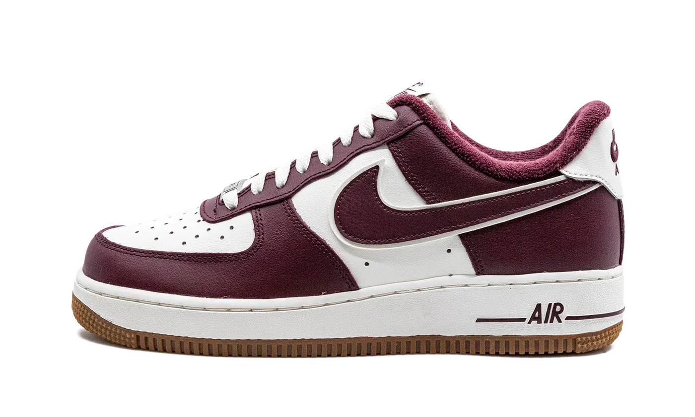The Nike Air Force 1 Low "College Pack - Night Maroon" is a colorway of the retro basketball sneaker with a classic, university-inspired look. The "Night Maroon" features a white leather base with contrasting Night Maroon leather overlays and raised Swoosh branding. A maroon "Nike Air" logo is embroidered on the white leather heel overlay. Additional "Nike Air" branding is found on the tongue tag. The shoe is complete with a white rubber midsole and gum outsole.