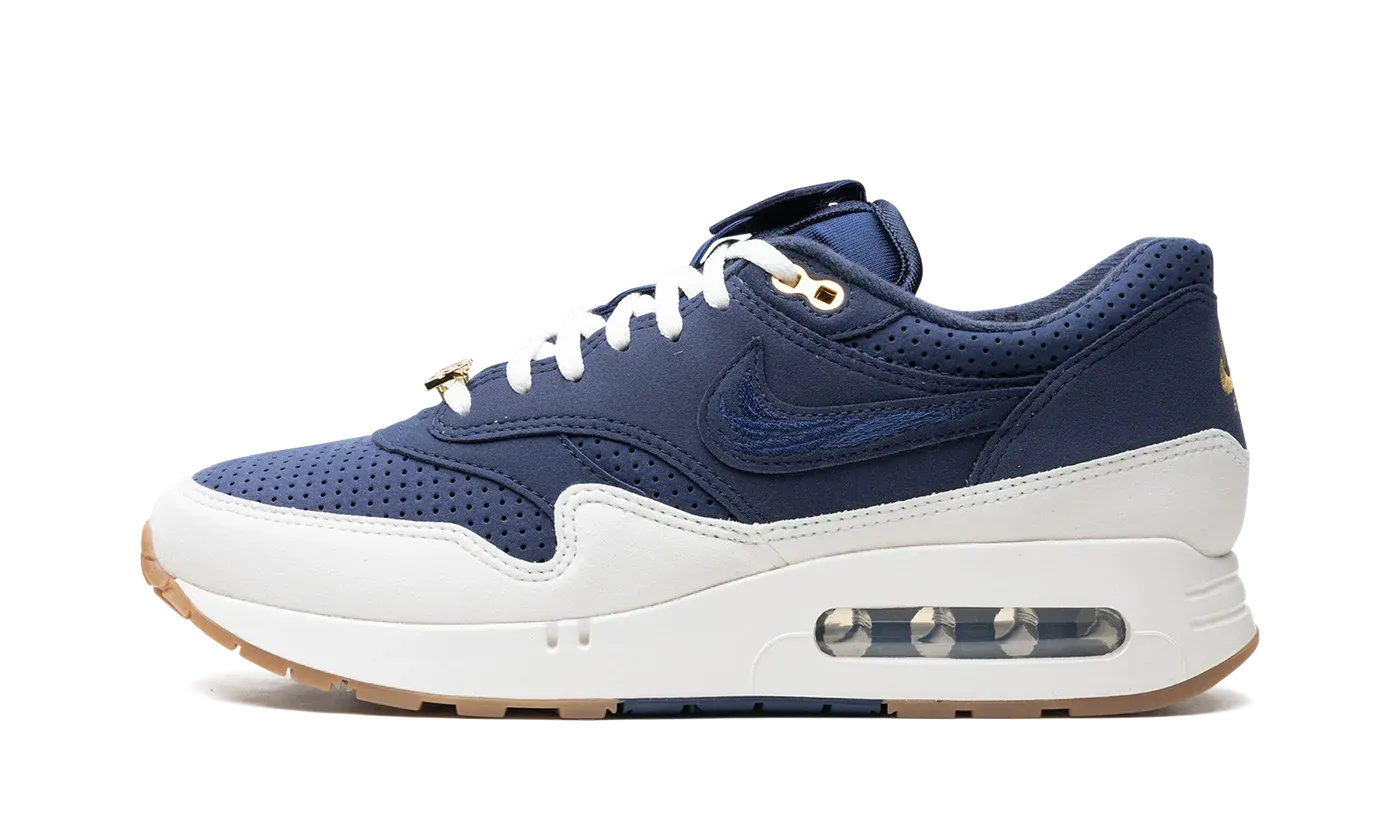 The Nike Air Max 1 '86 "Jackie Robinson" is a special colorway of the retro performance running shoe inspired by the Baseball Hall of Famer and his lasting impact in sports and civil rights. Jackie Robinson broke baseball's color barrier in 1947 when he played his first game for the Brooklyn Dodgers, and subsequently had a decorated career with the team thereafter. As for this colorway, the upper features a perforated navy suede base contrasted with tonal suede overlay. A navy suede Swoosh appears on the sides, while Metallic Gold eyelets give the shoe a premium look. Details inspired by Robinson's baseball career include a Metallic Gold "42" (for his jersey number with the Dodgers) emblem on the vamp, and "42" branding on the tongue tag in the shape of a baseball diamond. A white mudguard and midsole, and a Gum rubber outsole complete the look. Release date: April 15, 2024