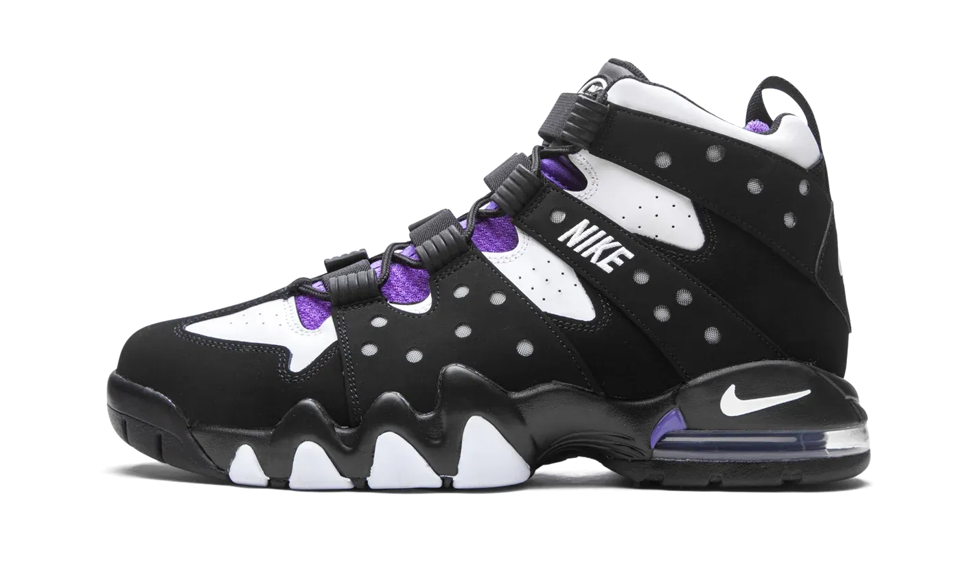 The Nike Air Max 2 CB '94 "2020 Retro" is an original colorway of Charles Barkley's signature performance basketball shoe from the '90s. Quintessentially retro from a design standpoint, the Air Max 2 CB '94 returns in its true-to-original form for this Fall 2020 release. The design by Tinker Hatfield, which is inspired by the look of a straitjacket, features a split white leather and black synthetic nubuck design along the eyelets and midsole, respectively. White "Nike" embroidery appears on the midfoot harness that supports the lacing system. Additional details include purple accenting on the nylon tongue, white "Nike Air" embroidery on the heel, and a mini Swoosh on back of the midsole. A visible Air unit in the heel with purple accenting completes the look of this classic hoops silhouette from Nike Basketball.