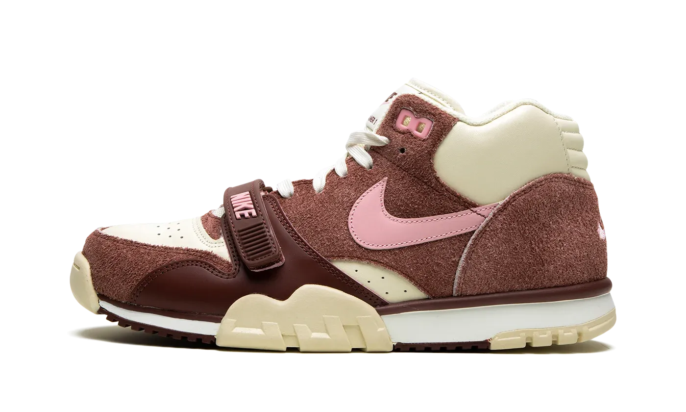 The Nike Air Trainer 1 "Valentine's Day" is a colorway of the retro cross-training shoe that is inspired by the February holiday and the chocolate candy associated with its festivities. As festive a colorway as there is for the Air Trainer 1, the "Valentine's Day" features shaggy brown suede overlay panels as a nod to chocolate candies that are often consumed around the holiday. A creamy white leather base and a pink leather Swoosh add to the look. Classic "Nike Air" branding is embroidered on the heel and pink "Nike" logo detailing is found on the adjustable brown midfoot strap.