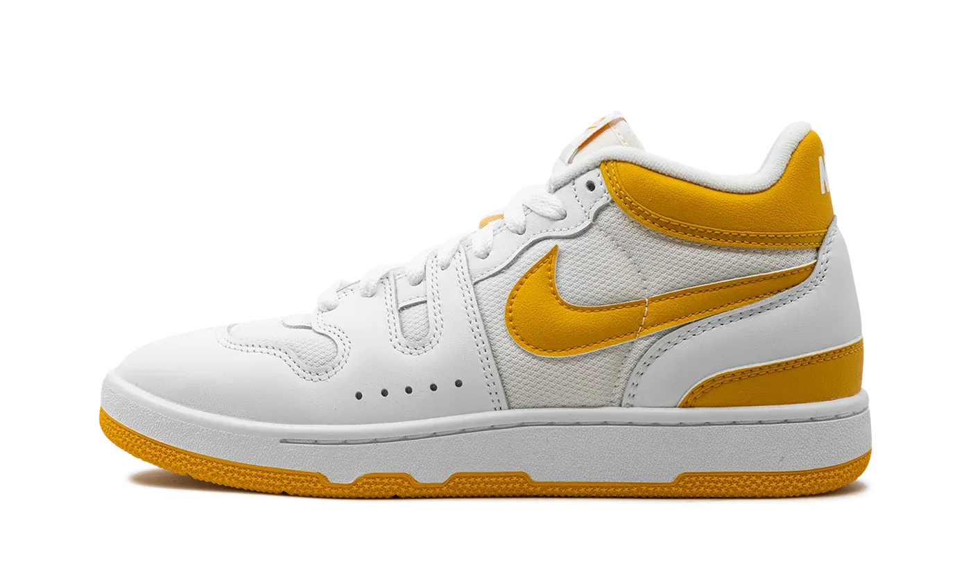 The Nike Mac Attack "Lemon Venom" is a colorway of the classic tennis shoe with eye-catching yellow accents. Debuted in 1984 and worn by tennis star John McEnroe in the mid-1980s, the Nike Mac Attack was one of Nike's first non-basketball shoes to achieve mass popularity. The "Lemon Venom" colorway features a white mesh base with white leather overlays. A Lemon Venom leather Swoosh appears on the side to match the yellow leather collar. The shoe's signature checkerboard-patterned logo tag appears on the tongue. Release date: December 7, 2023