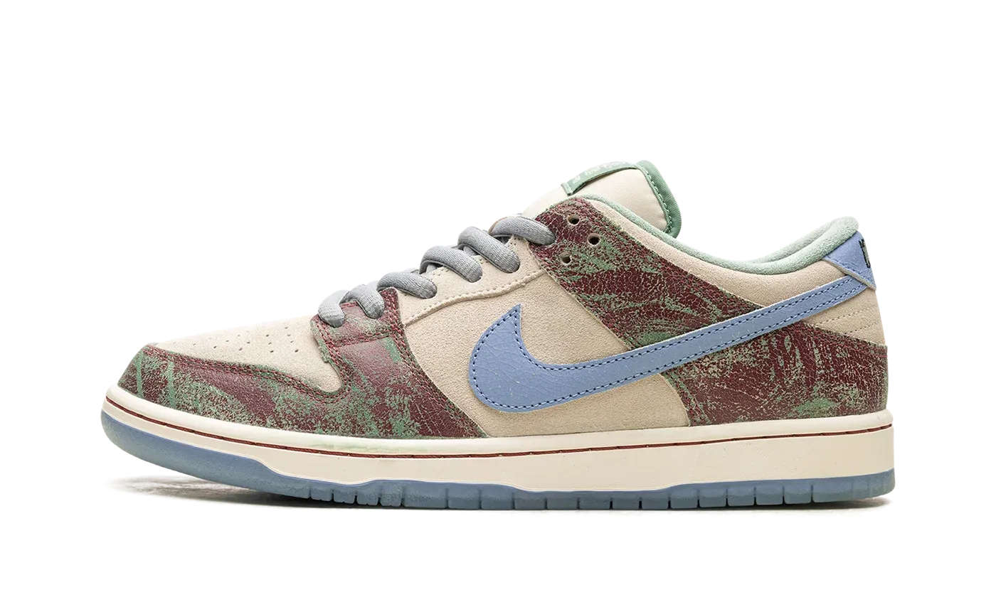 The Crenshaw Skate Club x Nike SB Dunk Low is a collaboration by the Los Angeles based skate brand on a colorway of the skate shoe that celebrates inner city skateboarding. Crenshaw Skate Club was founded in 2017 and here, lands its first-ever Nike SB Dunk collaboration. Crenshaw Skate Club adds its signature branding to the venerable SB Dunk. Its building-block-style logo appears on the underside of the tongue while its playful branding inspired the "Nike" and "CSC" logos on the heels of the left and right shoe, respectively. The light cream suede is contrasted with burgundy-colored leather overlays with mint green accenting. Underfoot, the cloud-inspired rubber outsole features Crenshaw Skate Club's signature graphics on the heel.