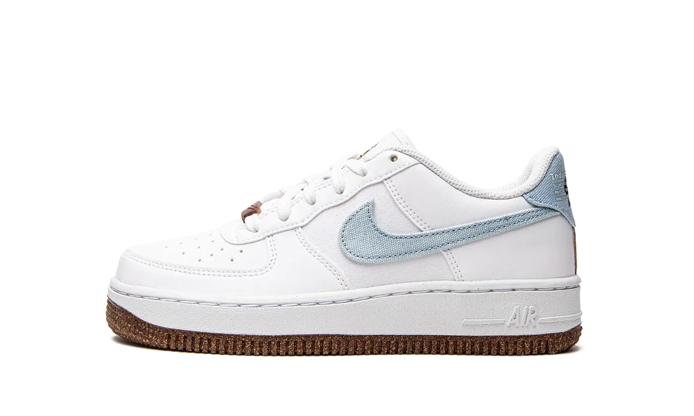 The Nike Air Force 1 Low LV8 GS "Indigo" is a youth version of the iconic low-top shoe that features a combination of materials on its design. The premium "Indigo" edition displays a mixture of white leather and canvas on the upper. Specifically, white leather appears on the perforated toe, forefoot, collar, and heel. White canvas can be found on the mid-panel. An indigo blue Swoosh logo appears on either side of the shoe. Additional denim detailing can be found on the heel tab beneath the "Nike Air" branding. Nike places a cork panel on the spine of the shoe. A white rubber midsole and contrasting "cork" rubber outsole complete the look.