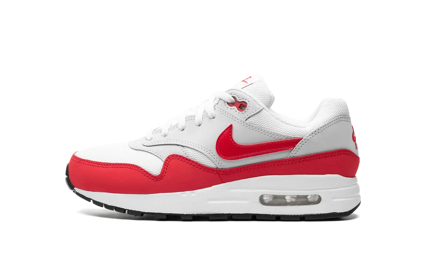 The Nike Air Max 1 GS "Sport Red" is the youth sizing of the retro running shoe in a classic colorway. The kids-sized version of the iconic Air Max 1 is featured here with a white mesh base contrasted with grey synthetic overlays on the mid-panel and heel. A red leather Swoosh is located on either side and a red "Nike Air" logo is embroidered on the heel. Red "Nike" and Swoosh logos are seen on the tongue tag. Underfoot, a clear Air bubble in the heel of the white foam midsole completes the design. Release date: July 1, 2023