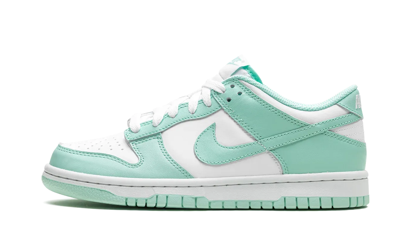 The Nike Dunk Low GS "Mint Foam" is the youth sizing of the retro basketball shoe in a colorway with a spring-ready appearance. The "Mint Foam" features a white leather base and Mint Foam-colored leather overlays and Swoosh branding on its design. Classic "Nike" detailing is embroidered on the heel, while "Nike" and Swoosh logos appear on the tongue tag. Underfoot, the shoe's white rubber midsole and Mint Foam rubber outsole complete the look.