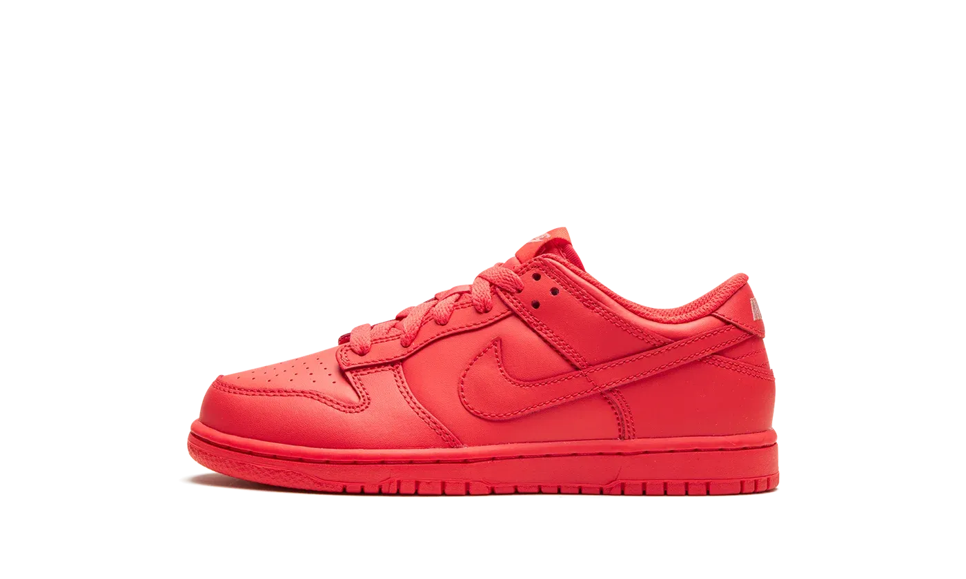 The Nike Dunk Low PS "Track Red" is the preschool sizing of the monochromatic red colorway of the classic sneaker. The upper features a Track Red leather construction with tonal leather overlays. A red leather Swoosh appears on the mid-panel. Light tan "Nike" branding is embroidered on the heel as well as on the tongue. Red laces and a red rubber sole complete the shoe's vibrant, monochromatic red appearance.