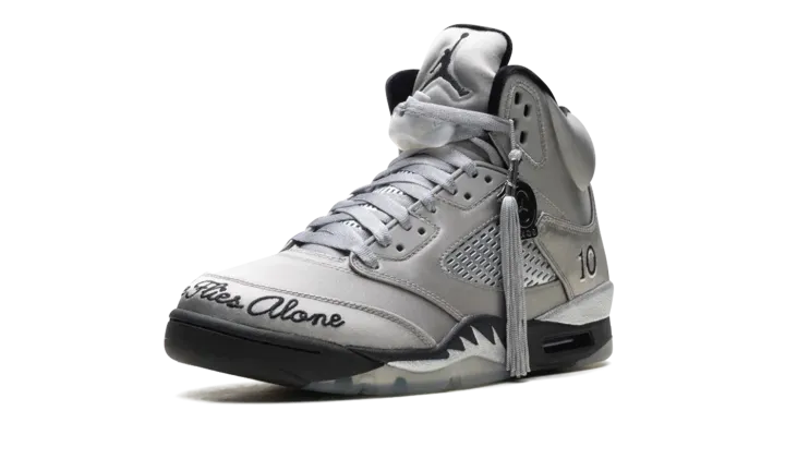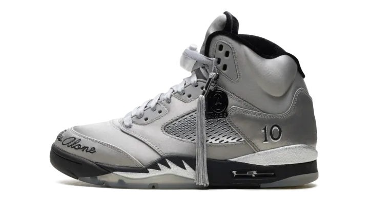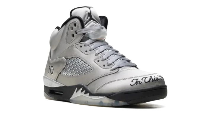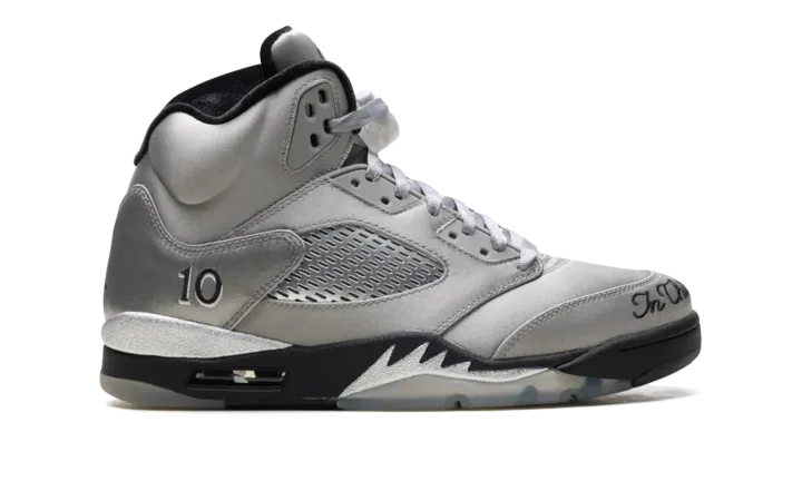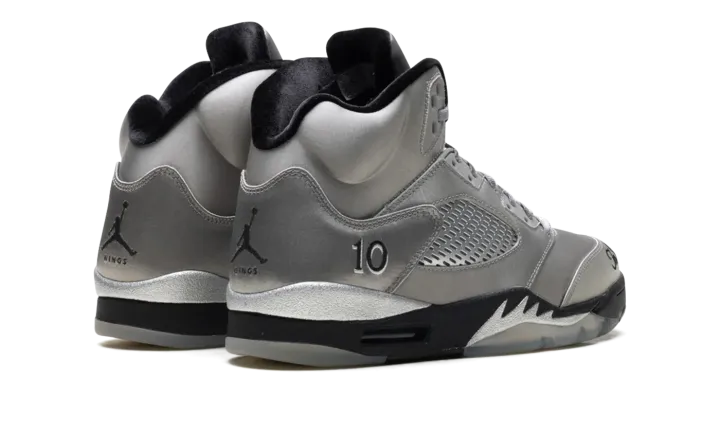 Fly high with the Air Jordan 5 Retro WMNS "Wings (2025)." This women's-exclusive sneaker celebrates the 10th anniversary of the Jordan Brand Wings scholarship program. It features a stunning Metallic Silver satin upper, accented by black detailing, and the iconic AJ5 design elements. Special nods include "In This Family No One Flies Alone" text on the toe and a unique hand-print graphic on the translucent outsole, blending luxury with a powerful mission.