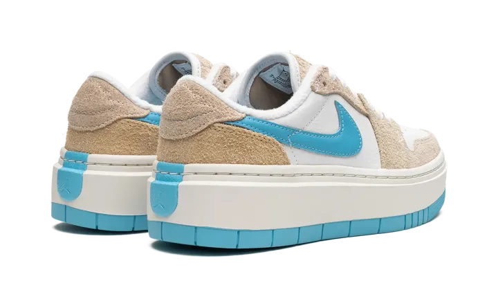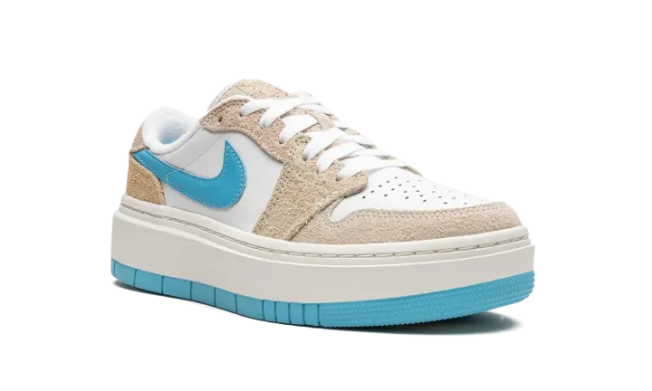 The Women's Air Jordan 1 Low Elevate SE "Salt Lake City" is a women's-exclusive colorway of the popular lifestyle shoe loosely inspired by the Utah Jazz. In no way associated with the NBA franchise, the "Salt Lake City" nonetheless nods to the basketball team with its use of colors on its design. The shoe features a white leather base with Sanddrift-colored suede overlays with a Baltic Blue leather Swoosh. A "bubble" style "Wings" logo can be found on the heel. The Jordan 1 Low Elevate features an exaggerated, platform-style white rubber midsole that adds significant height to the shoe's profile. Release date: February 19, 2023