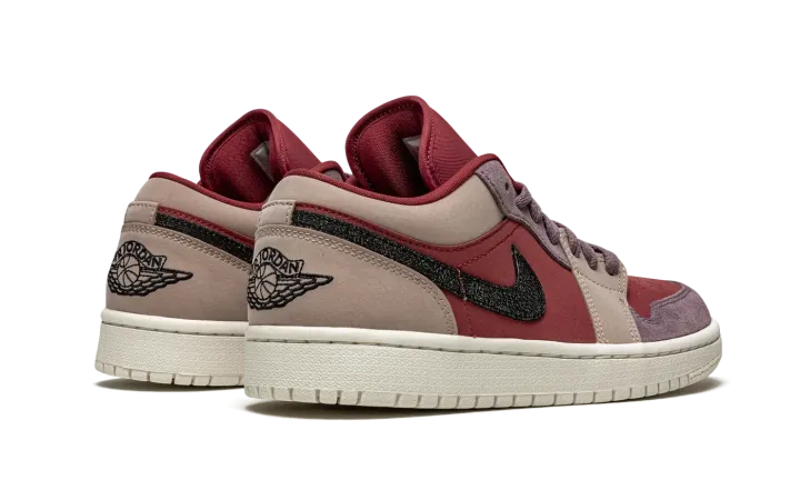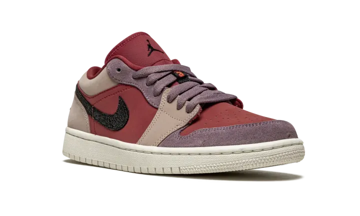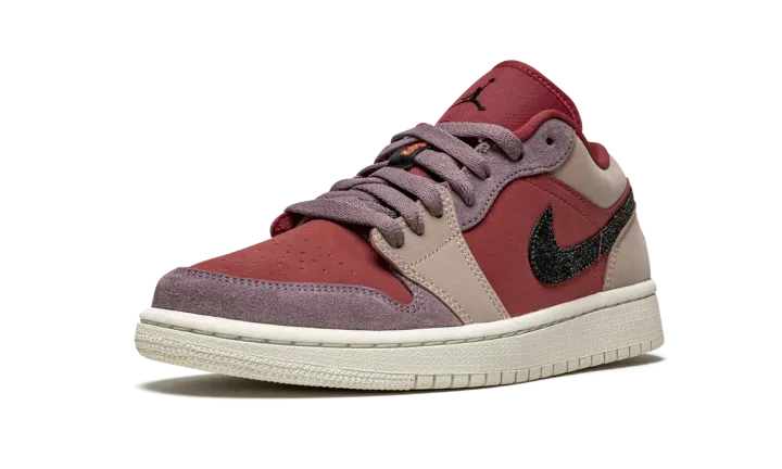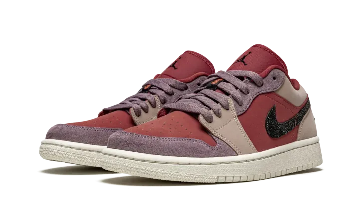 The Women's Air Jordan 1 Low "Canyon Rust" is a women's version of Michael Jordan's first signature shoe in a unique mix of tones. Yet another vibrant look for the popular low-top Jordan 1, the "Canyon Rust" features synthetic nubuck panels in Canyon Rust on the perforated toe and on the mid-panel and on the nylon tongue. Beige overlays appear on the forefoot, lower eyelets, collar, and heel. Elsewhere, buttery Purple Smoke suede detailing can be found on the toe cap and upper eyelets and the same shade of dusty purple is used on the laces. A black Swoosh with glitter speckling appears on either side and a black "Wings" logo is embroidered on the heel.
