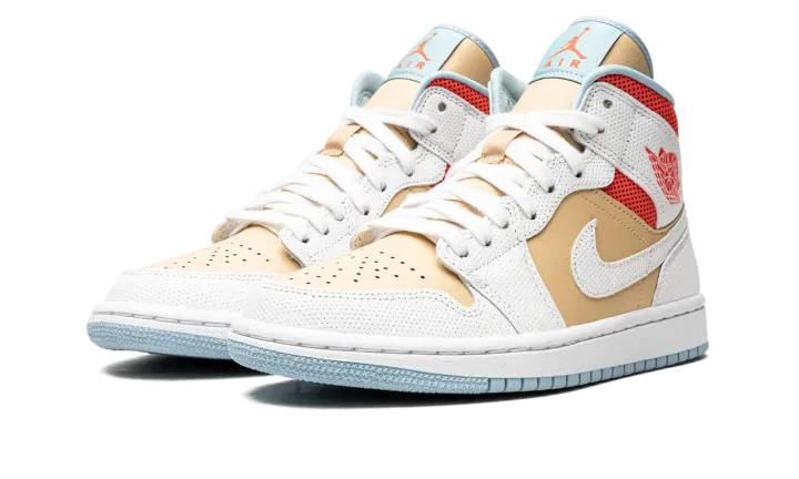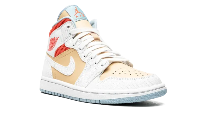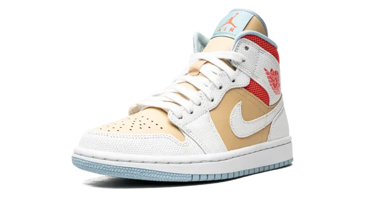 The Women's Air Jordan 1 Mid SE "Sesame" is a women's colorway of the comfortable lifestyle shoe by Jordan Brand that features a unique mixture of textures and colors. Lauded for its easy-to-wear style, comfort, and association to the greatest basketball player of all-time, the mid-top iteration of Michael Jordan's first signature shoe is among the most consistent offerings in Jordan Brand's collection, and that sentiment rings true on the "Sesame" colorway. Sesame leather graces the perforated toe, mid-panel, and tongue. Contrasting dotted white leather panels break up the look of the forefoot, eyelets, collar, heel, and Swoosh. A red "Wings" logo appears on the collar and an orange Jumpman with "Air" detailing highlight the look of the white nylon tongue tag stitched onto the tongue. Jordan Brand puts the finishing touches on the design by painting the both the rubber midsole and outsole in white and icy blue, respectively.