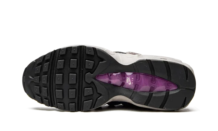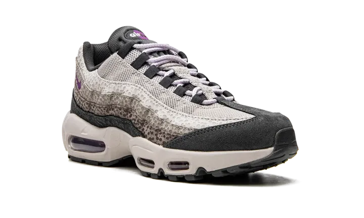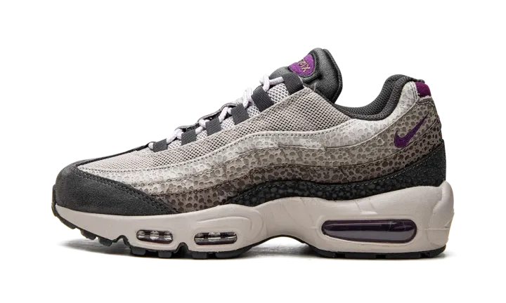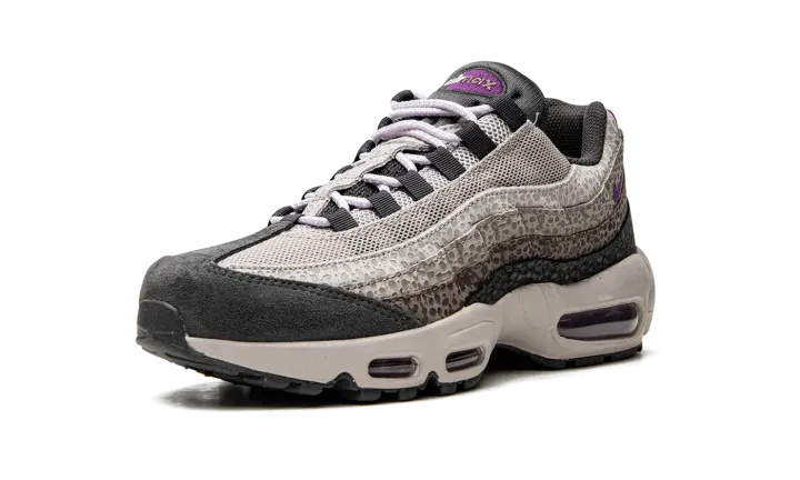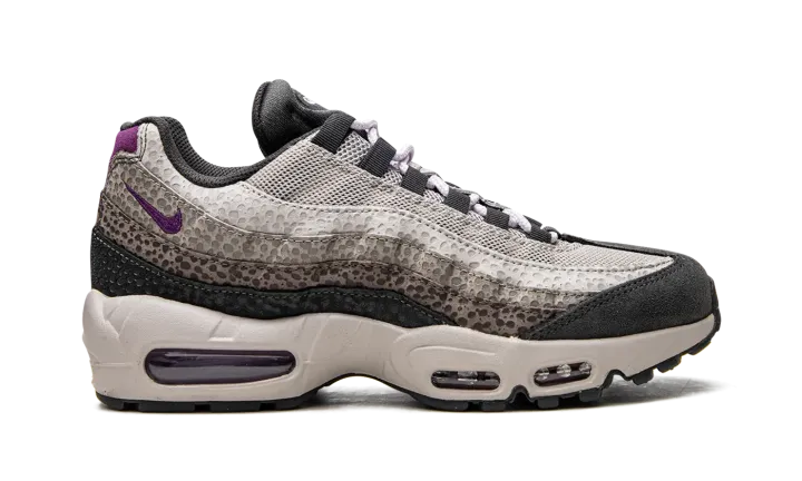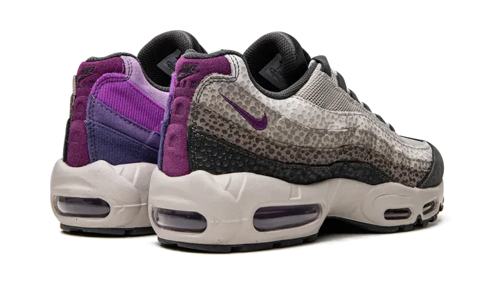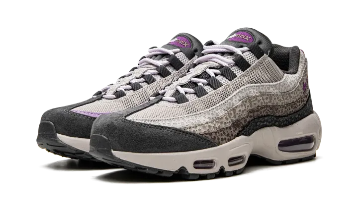 The Women's Nike Air Max 95 "Viotech Safari" is a women's-exclusive colorway of the classic running shoe with a mismatched design. The "Viotech Safari" features a safari-style pattern on the lateral side of the shoe's wavy, light-to-dark grey gradient panels. The medial side of the shoe is complete with purple tones in suede and corduroy panels. A black synthetic overlay appears on the toe. Branding is found in the form of a Viotech-colored Swoosh embroidered on the collar. The Air Max 95's signature split "Air Max" tongue emblem appears in black and purple. Visible Max Air cushioning pods in the forefoot and heel of the grey foam midsole completes the look. Release date: August 24, 2022