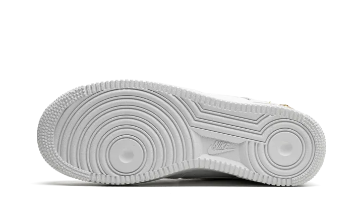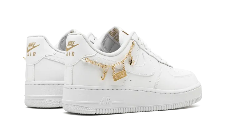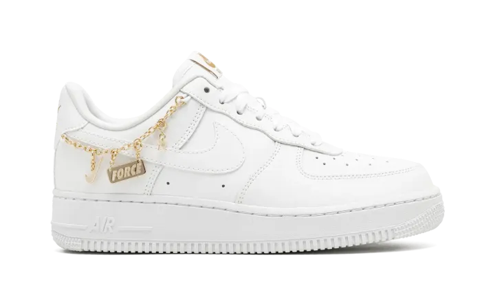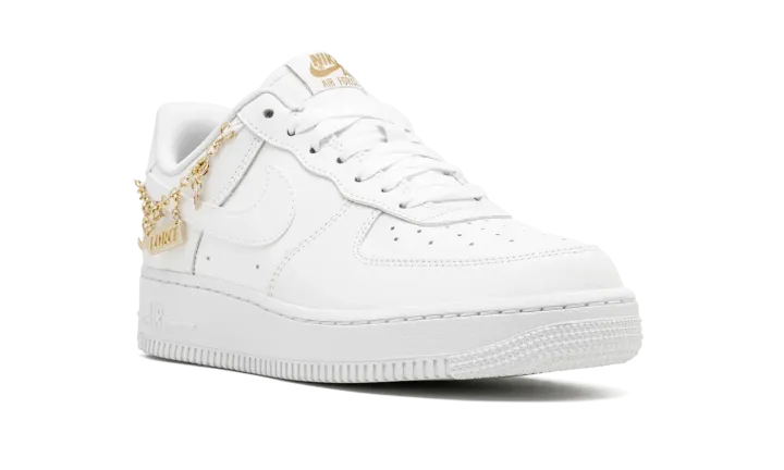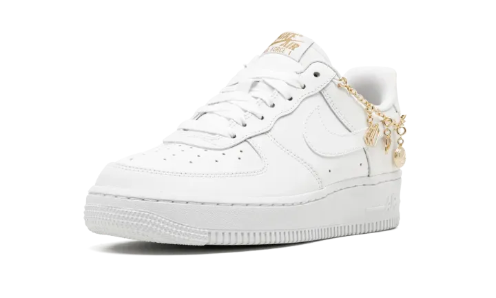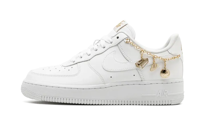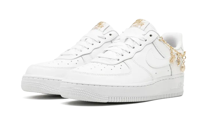 The Women's Nike Air Force 1 Low "Lucky Charms" is a women's version of the retro basketball shoe in a casual, white-based colorway that features added jewelry on its design. The "Lucky Charms" is one of several women's-exclusive variations of the Air Force 1 with flashy jewels on its design, the others being the "Bling" and Air Force 1 Shadow "Charms." On the "Lucky Charms," the entire upper, including the perforated toe, overlay panels, and Swoosh branding, are designed in white leather. Contrasting Metallic Gold "Nike Air" and Swoosh detailing are embroidered on the heel and printed on the white nylon tongue tag. A Metallic Gold chain with Nike-adjacent charms is found on the collar. Release date: November 11, 2021