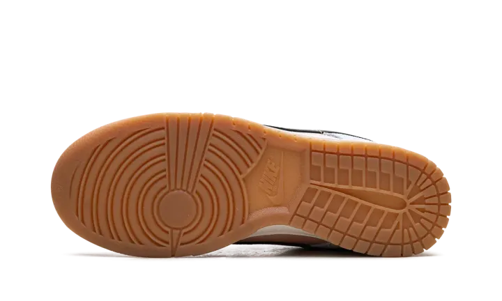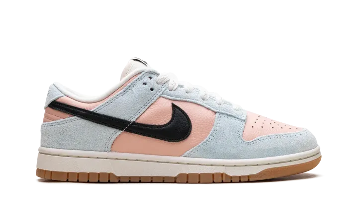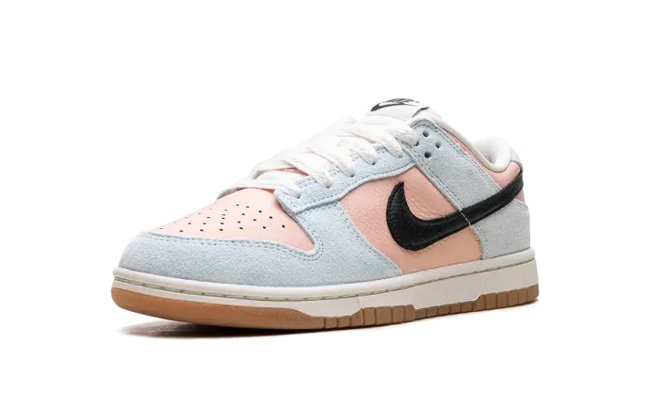 The Nike Women's Dunk Low 'Glacier Blue Arctic Orange' showcases a solid black leather Swoosh on the upper, which is crafted from pink tumbled leather with suede overlays in a light blue hue.