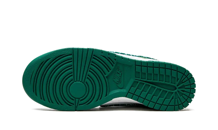 The Women's Nike Dunk Low "Green Paisley" is a women's-exclusive colorway that switches up the design of the Swoosh branding on the classic basketball and lifestyle shoe. From Nike's Spring 2022 release cycle, the "Green Paisley" features the same two-tone color block of many legendary Dunk styles, albeit with a modified green paisley Swoosh on the sides that replaces the model's standard leather branding. The upper is complete white a white leather base with contrasting green leather overlays. Classic "Nike" branding is embroidered on the green paisley heel tab and printed on the tongue tag on the green nylon tongue.