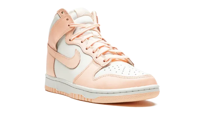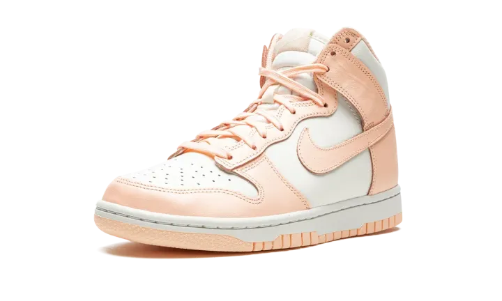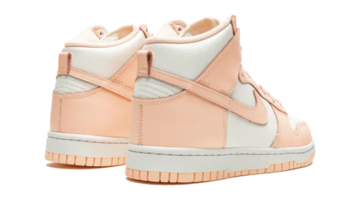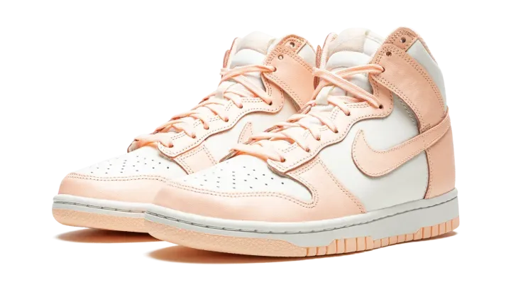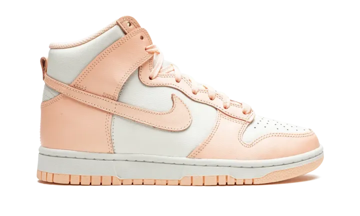 The Women's Nike Dunk High "Crimson Tint" is one of several women's exclusive colorways of the timeless lifestyle shoe released by Nike in June 2021. Ideal for summer and beyond, the "Crimson Tint" is reminiscent of the "Orange Pearl" Dunk from March 2021, featuring a white-and-orange color block. The shade of orange used on the "Crimson Tint," however, is more pink in hue than the "Orange Pearl." The perforated toe, mid-panel, and collar display a smooth white leather construction. The eyelets and Swoosh are cast in Crimson Tint leather. Both the laces and the tongue tag with white "Nike" branding stitched onto the white nylon tongue display a Crimson Tint design. Release date: June 26, 2021.