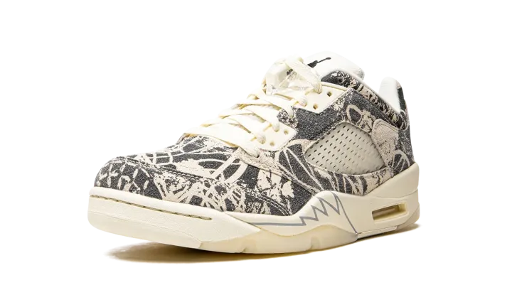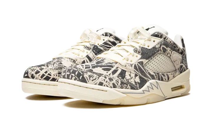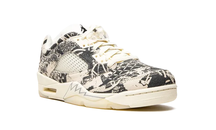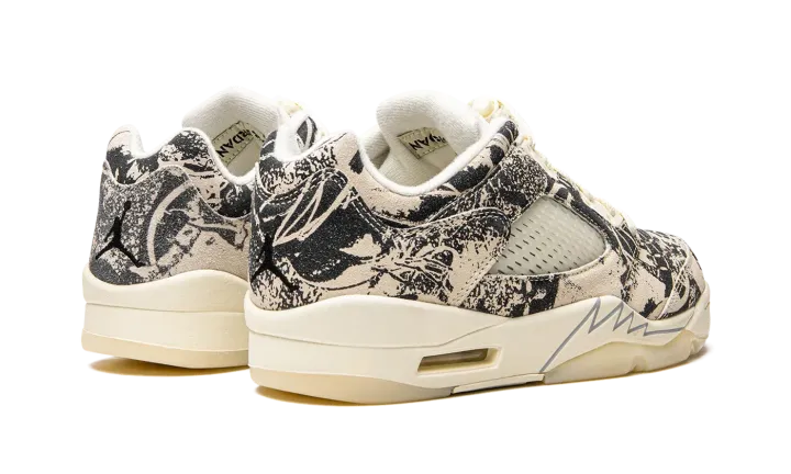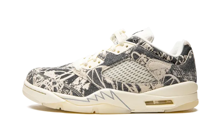 The Women's Air Jordan 5 Low "Expression" is the women's sizing of the retro basketball shoe in a colorway with an abstract, mismatched design. As noticeable a shoe as any from Jordan Brand in 2022, the "Expression" Women's Jordan 5 Low is complete with a tan and brown print throughout its upper. The look varies slightly from the left shoe to the right shoe. Translucent netting appears on the tongue and mid-panel. A black Jumpman logo is embroidered on the heel and on the tongue. Cream laces and a cream rubber midsole with grey outline sharktooth detailing complete the look. Release date: September 24, 2022