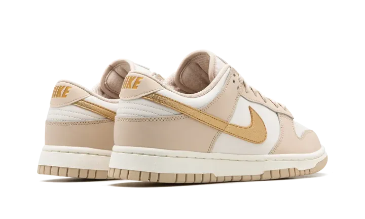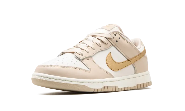 The Women's Nike Dunk Low "Phantom/Metallic Gold" is a women's-exclusive colorway of the classic low-top shoe with a premium-looking design. In the "Phantom/Metallic Gold" rendition, Nike updates the retro basketball shoe with a white leather construction with Phantom-colored leather overlays. A Metallic Gold leather Swoosh appears on the sides and gold "Nike" branding is embroidered on the heel. Additional gold accenting includes a "Nike" logo on the tongue. A Sail midsole and Phantom rubber outsole complete the look.