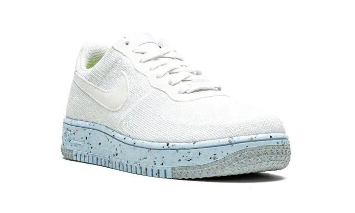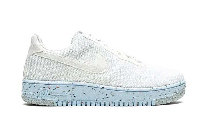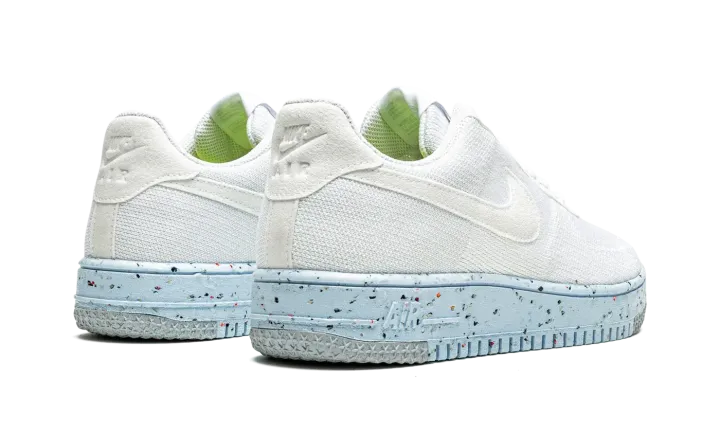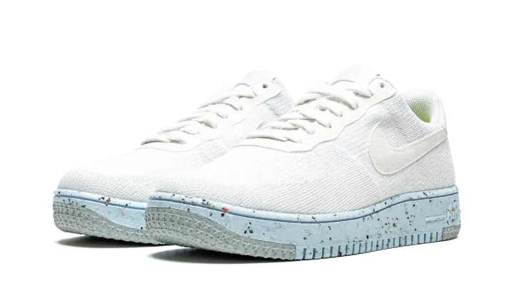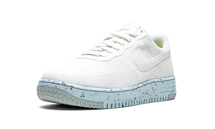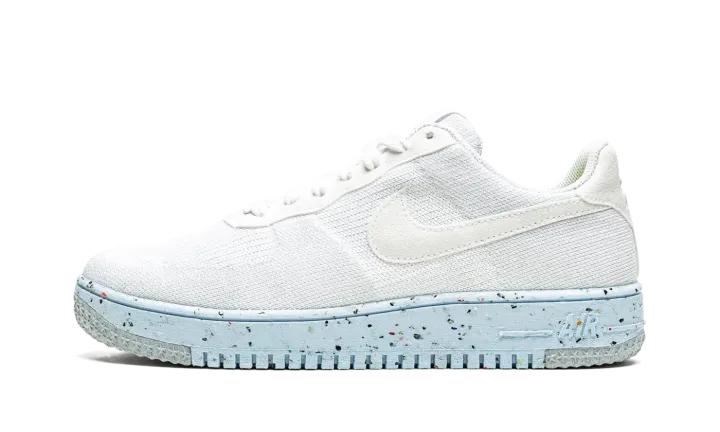 The Women's Nike Air Force 1 Crater Flyknit "White" is a modern take on the classic basketball shoe that updates the silhouette with environmentally friendly materials. Ultra lightweight, the shoe's upper is composed of Nike's Flyknit material that's both durable and breathable in design. A suede Pure Platinum Swoosh appears on either side and embossed "Nike Air" with a Swoosh branding graces the suede heel tab. The Air Force 1 Crater Flyknit for women rides on a speckled Crater foam midsole that's composed of Nike's "Grind" material.