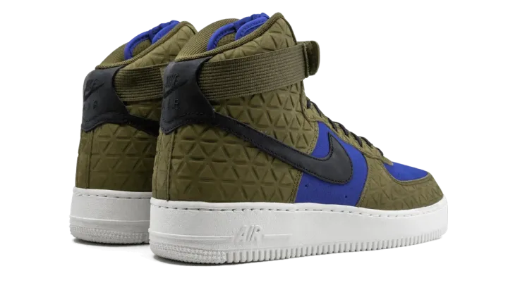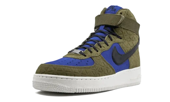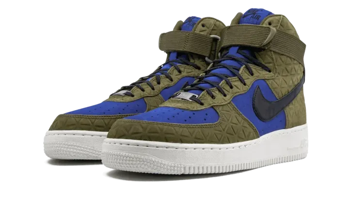 The Nike Air Force 1 Hi Premium Suede is a women's lifestyle sneaker presented in a royal blue and olive green color scheme with black accents on the Swoosh, laces, and Nike branding. The shoe design adds flair with textural suede overlays that take on a 3D-geometric pattern. The Nike Air Force 1 Hi Premium Suede comes with a trademark ankle strap and is finished with a contrasting white midsole and outsole.