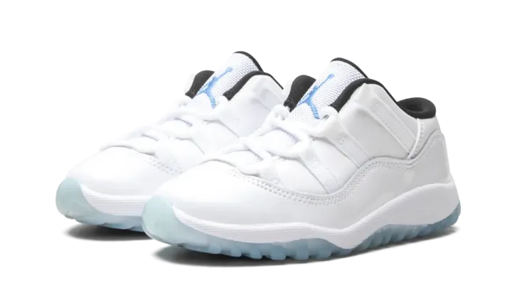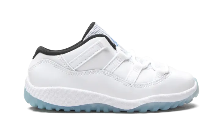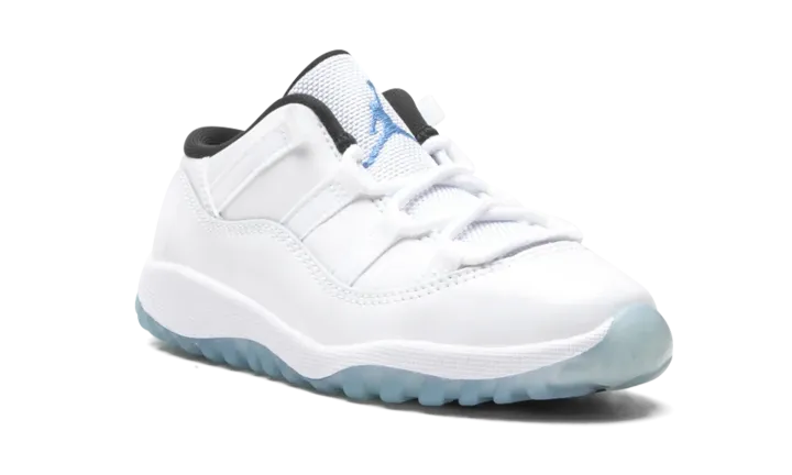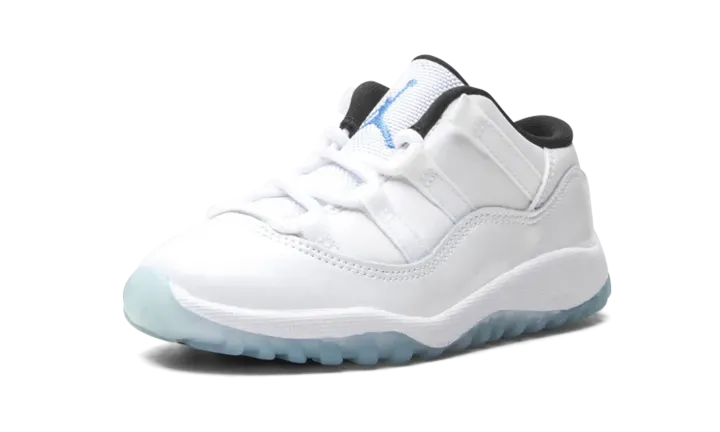 The Air Jordan 11 Low TD "Legend Blue" is the toddler sizing of a colorway based on an original makeup of Michael Jordan's eleventh signature shoe. Nike released the Air Jordan 11 "Columbia" in 1996 as a tribute to Michael's alma mater, the North Carolina Tar Heels. In 2014, the colorway was repackaged as the "Legend Blue" and, in 2021, was converted to a low-top and made available in full family sizing. The design seen here shares many similarities with the original look. A crisp white leather upper and white patent leather mudguard is on par with the "Columbia." A white mesh tongue with Legend Blue "Jumpman Jordan" branding contrasts the look of the black inner lining. A small blue Jumpman appears on the heel. An icy blue semi-translucent outsole completes the look. Release date: May 7, 2021.