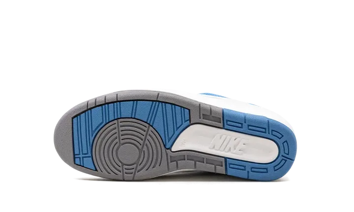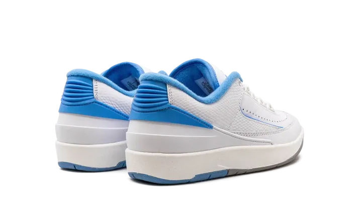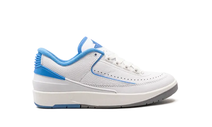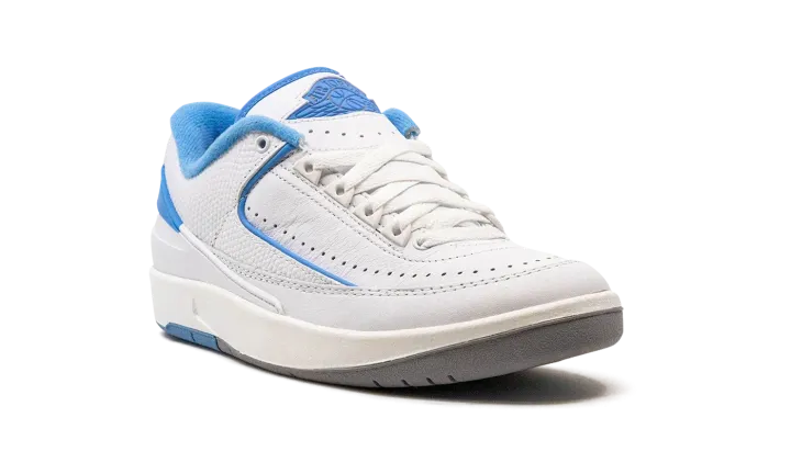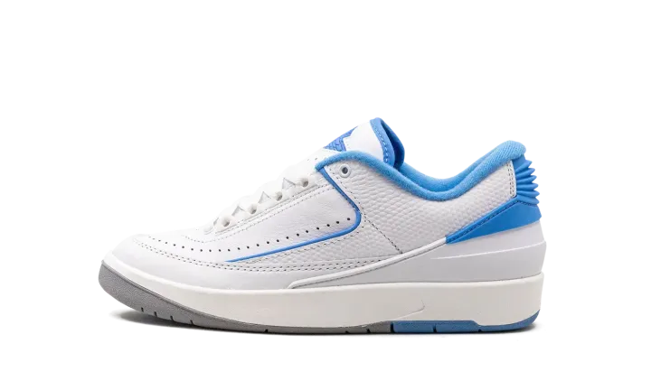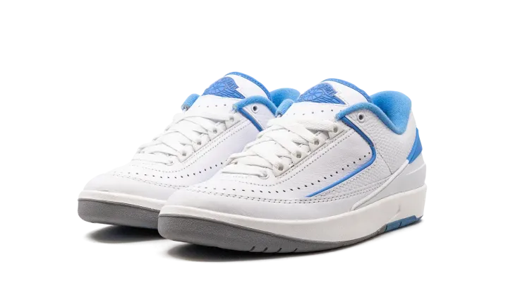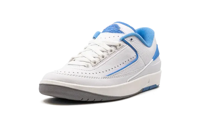 The Air Jordan 2 Low GS "University Blue" is the youth sizing of the retro basketball shoe inspired by Michael Jordan's college days at the University of North Carolina. The "University Blue" Jordan 2 for kids features features a white leather construction with University Blue piping along the white leather upper overlay. The "UNC" inspired hue is also found on the heel counter and on the inner lining. It also lands on the "Wings" logo on the tongue. An off white midsole and grey outsole complete the look. Release date: July 22, 2023