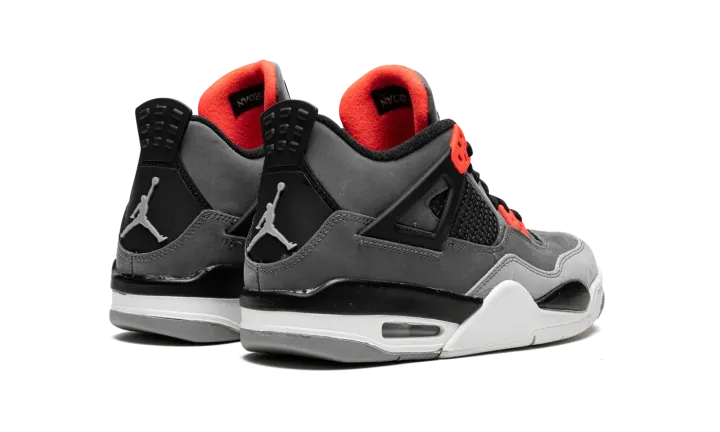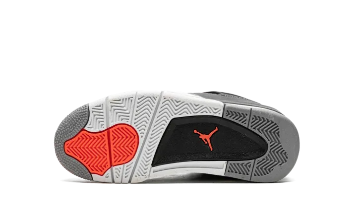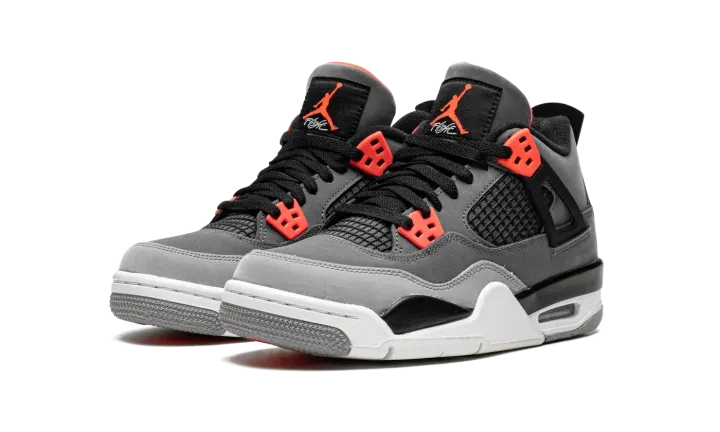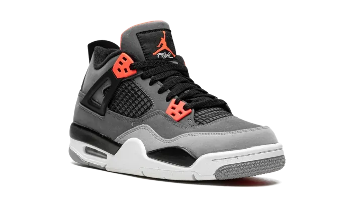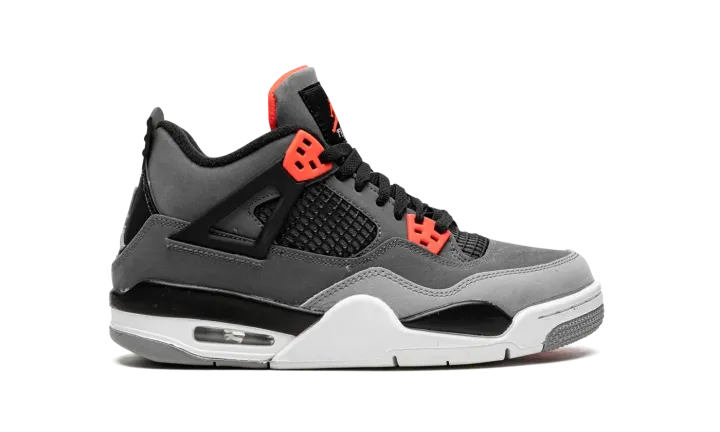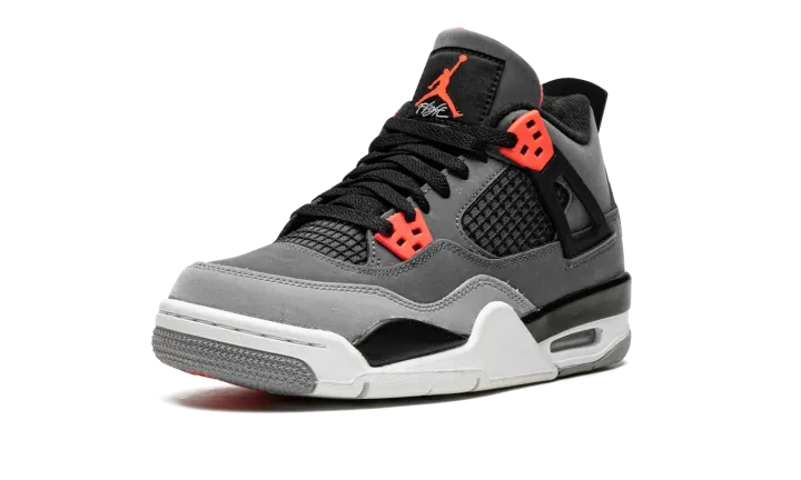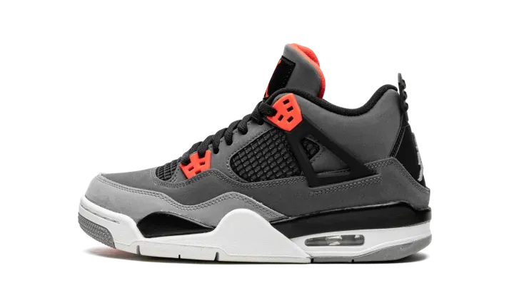 The Air Jordan 4 GS "Infrared" is the youth sizing of Michael Jordan's fourth signature shoe in a colorway inspired by a classic Nike Air Max 90 style. The shoe in question is the Air Max 90 "Infrared," the iconic, original colorway of the vintage running shoe that features black, grey, and neon red accents. The Jordan 4's interpretation of the look features a dark grey synthetic nubuck upper with a light grey toe guard. The netting found on the sides and on the tongue is arranged in black, as are the "wings." Fiery Infrared accenting comes into play on the eyelets, on the Jumpman branding on the tongue tag, and on the underside of the tongue. A visible Air unit is found in the heel of the white foam midsole. Release date: June 15, 2022