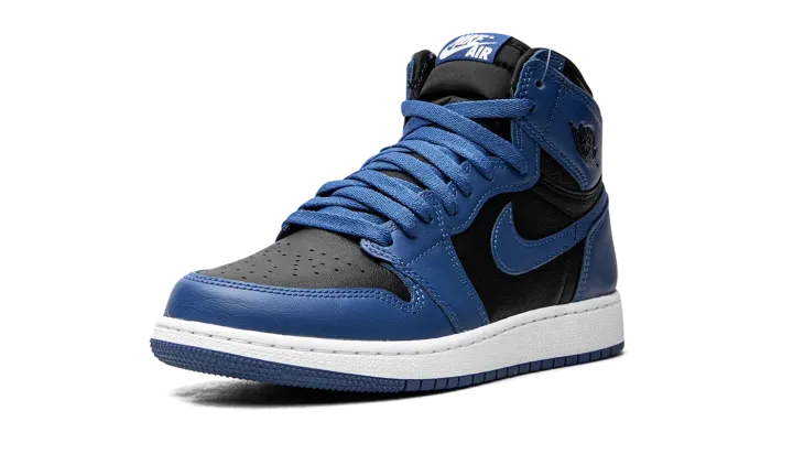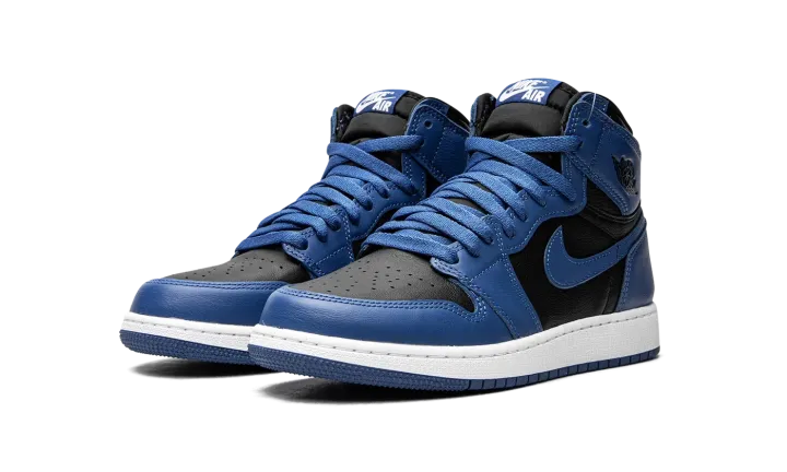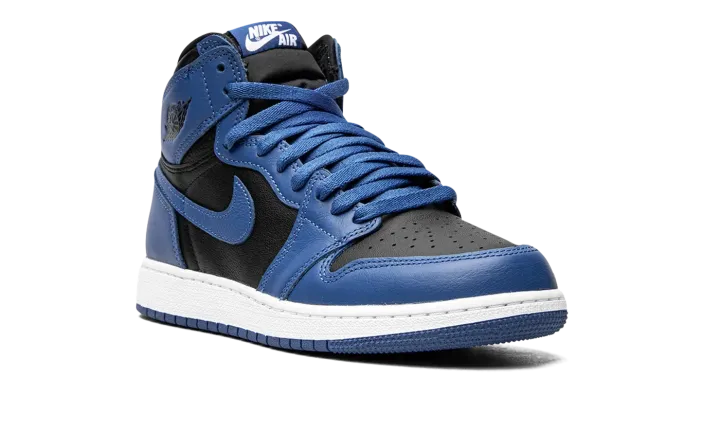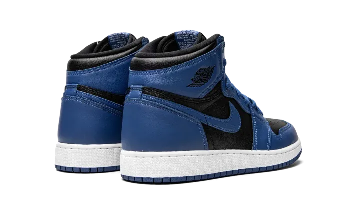 The Air Jordan 1 High OG GS "Dark Marina Blue" is the grade school sizing of the vintage basketball shoe in a colorway that mimics the appearance of an original, iconic Jordan 1. The shoe in question is Michael Jordan's first signature shoe, the Air Jordan 1, in the "Royal" colorway. The "Dark Marina Blue" appears in a similar blue hue, and with a slightly altered color block in comparison to the original "Royal." The black leather base allows for the Dark Marina Blue-colored leather overlays and Swoosh branding to garner attention. A black "Wings" logo appears on the collar. Old school "Nike Air" and Swoosh branding are designed in white on the tongue tag. Black laces are layered over a black nylon tongue. Release date: January 15, 2022