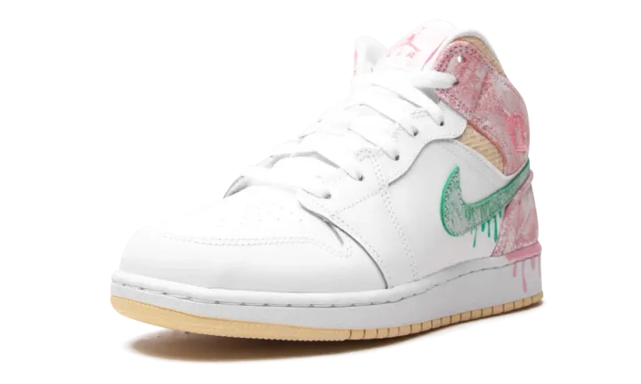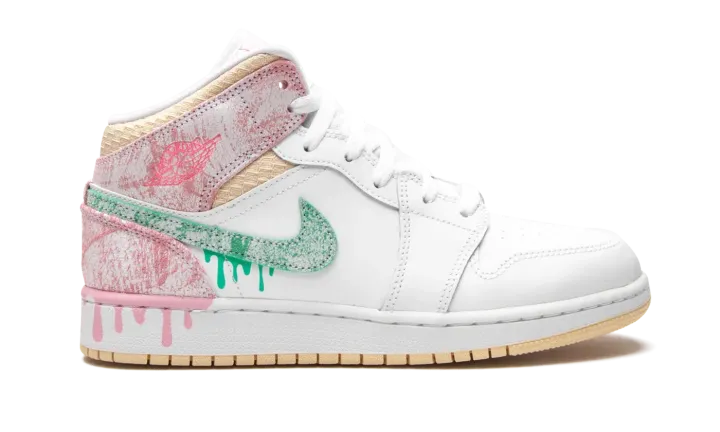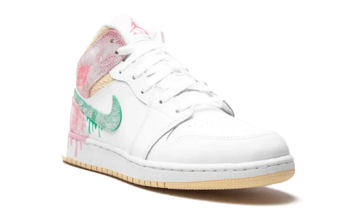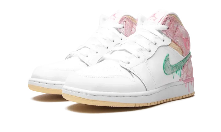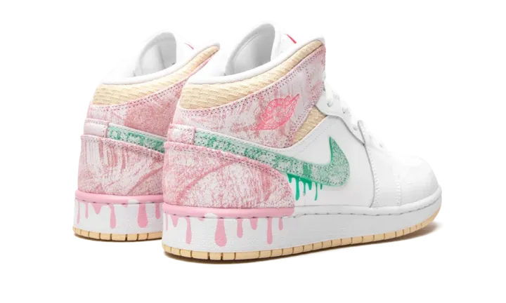 The Air Jordan 1 Mid SE GS "Ice Cream" is a youth-sized, summer-inspired colorway of Michael Jordan's first signature shoe. With drippy green-and-pink paint on the Swoosh and collar, respectively, the "Ice Cream" makeup of the popular Jordan 1 Mid is inspired by the delicious warm weather treat. A golden honeycomb design appears on the collar for the full ice-cream-melting-from-an-ice-cream-cone effect. An embroidered pink "Wings" graphic is stitched onto the collar and pink nylon pull tab can be found on the heel. A white leather base balances out the look. Jordan Brand places a pink Jumpman on the tag stitched onto the white nylon tongue. The final references to ice cream take place on the bottom of the shoe where a white midsole and contrasting tan outsole mimics the look of vanilla ice cream inside of an ice cone.