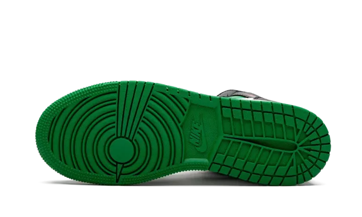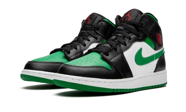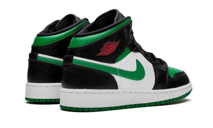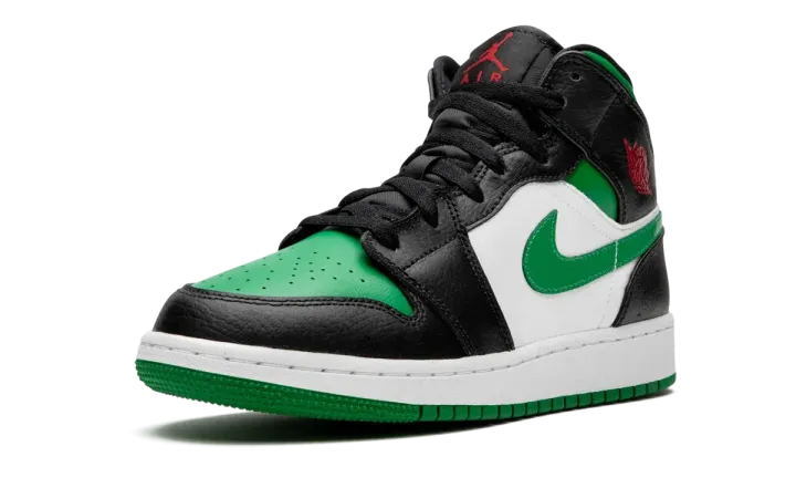 The Air Jordan 1 Mid grade school style is an exact replica of the adult "Green Toe" model. The kids' shoe is done up with premium black leather overlays that contrast the white and kelly green leather base. Jordan Brand references classic Air Jordan 1 styling by equipping the shoe with a perforated green leather toe, while vibrant red Wings branding on the black collar finishes it off.