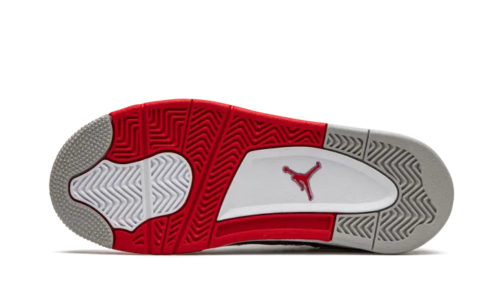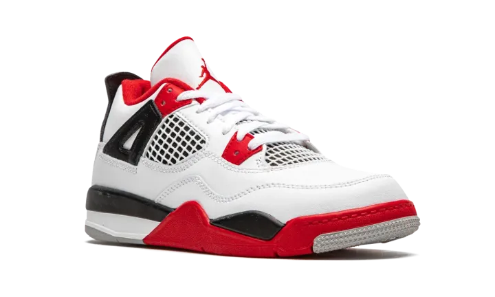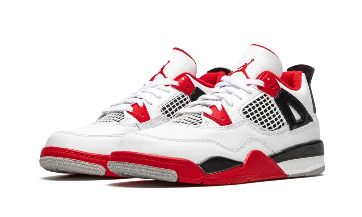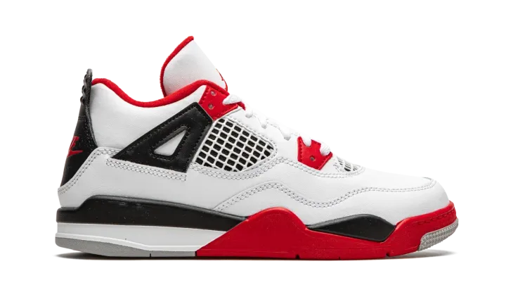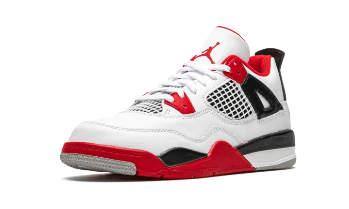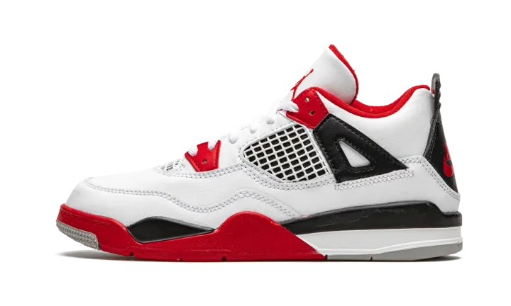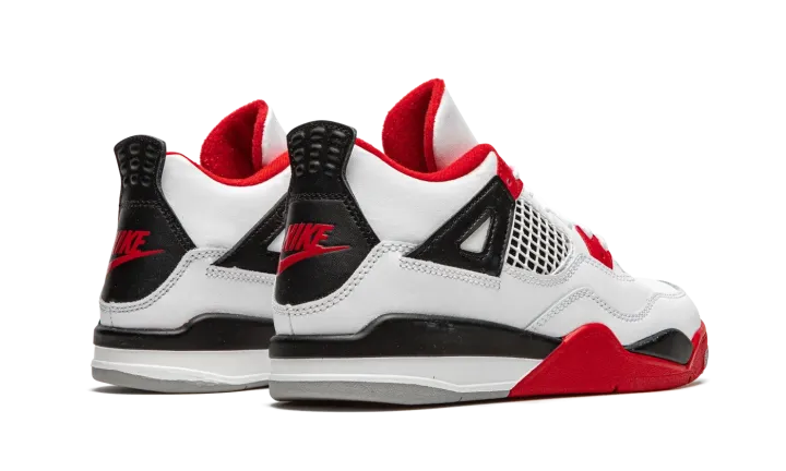 The Air Jordan 4 PS "Fire Red 2020" is the preschool youth sizing of one of the four original colorways of Michael Jordan's fourth signature shoe. A November 2020 release, the "Fire Red" seen here marks the first time the colorway has featured the iconic Nike branding on the back of the shoe since the original release in 1989. Keeping the shape and color scheme as close to the original as possible, the upper features white leather on the toe, collar, and heel. White netting is located on the throat and mid-panel. The eyelets, liner, and outsole feature Fire Red accenting per the "OG" look. Branding appears in the form of a red Jumpman on the tongue tag and the red "Nike Air" logo on the heel. Finishing touches include a back mudguard and white midsole with a clear Air window in the heel. Release date: November 28, 2020.