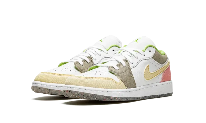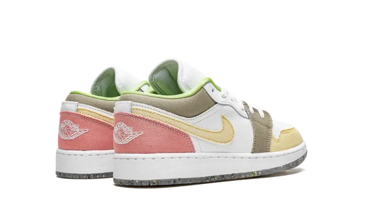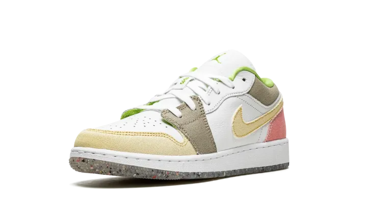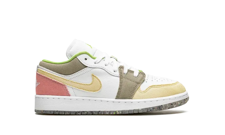 The Air Jordan 1 Low "Pastel Grind" presents a springtime color palette for grade schoolers. Sized for the kids, this iconic low-profile version of Michael Jordan's signature shoe is made with a white leather base covered with pastel-colored canvas overlays. The colors vary from tan to yellow, pink, and green. Other distinct details include green embroidery on the white tongue and a "Wings" logo embroidered on the pink heel. The best part of all? The Air Jordan 1 Low rests on a white sole with a translucent Nike Grind outsole made of recycled materials.