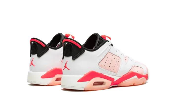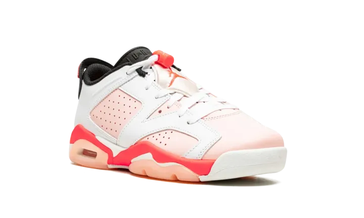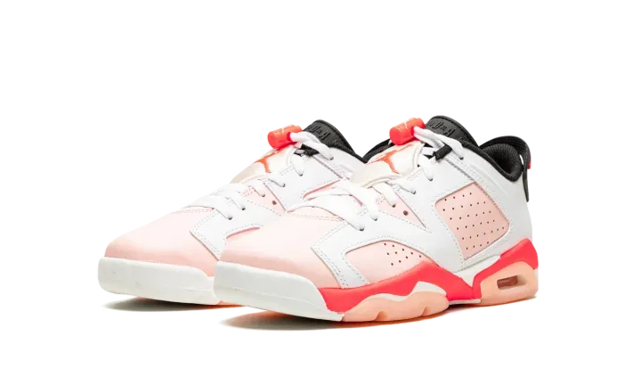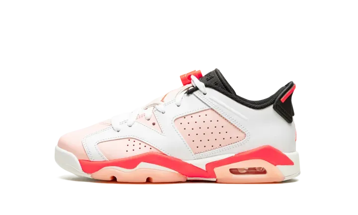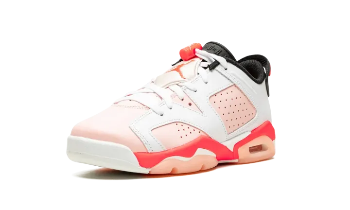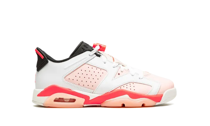 The Air Jordan 6 Low GS 'Atmosphere" is a kids-exclusive colorway of the low-top version of Michael Jordan's sixth signature shoe. The "Atmosphere" Jordan 6 in youth sizing was released in January 2022 and is complete with a light pink leather base with perforations on the forefoot and mid-panel. The overlay panels are designed in white tumbled leather and pink Jumpman is embroidered on the heel. Additional pink accenting is found on the back of the black heel tab or "spoiler" and on the Jumpman that's embroidered onto the neoprene lace overlay. A pink lace toggle with a white Jumpman adds to the old school basketball shoe's vintage appearance. Release date: January 3, 2022