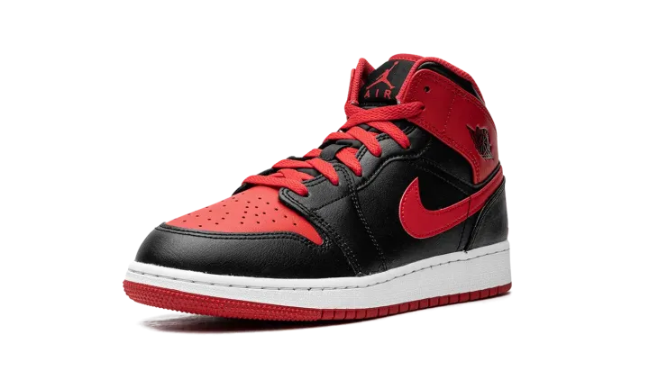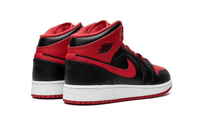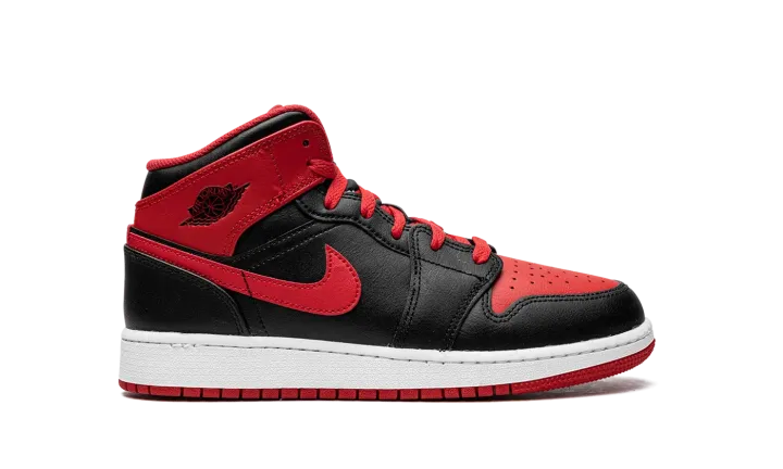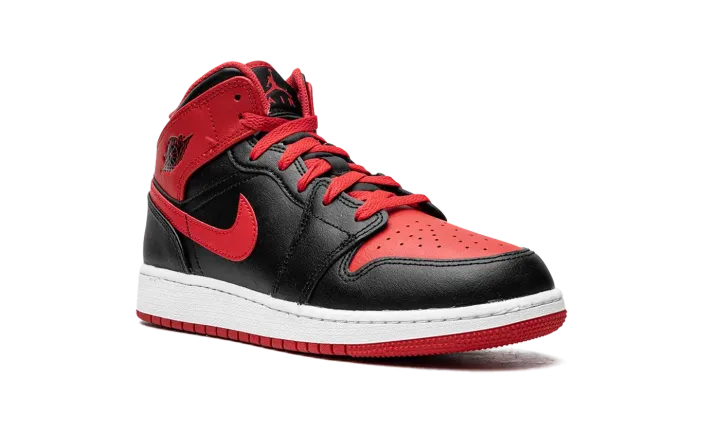 The Air Jordan 1 Mid GS "Alternate Bred" is the youth sizing of the modified version of the classic, original Jordan 1 colorway that debuted in 1985. As its name suggests, the "Alternate Bred" switches up the look of the Air Jordan 1's "Bred" makeup by changing its black-and-red color block ever so slightly. The "Alternate Bred" features a Fire Red leather perforated toe, while the rest of the base is designed in black leather. A Fire Red leather Swoosh appears on both sides of the shoe. A red leather overlay is found on the collar with a black "Wings" logo. Underfoot, a white rubber midsole and red outsole complete the look. Release date: November 12, 2022