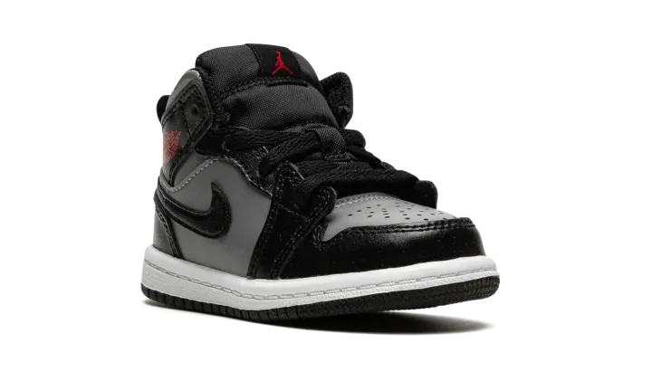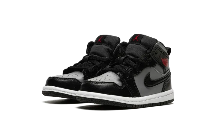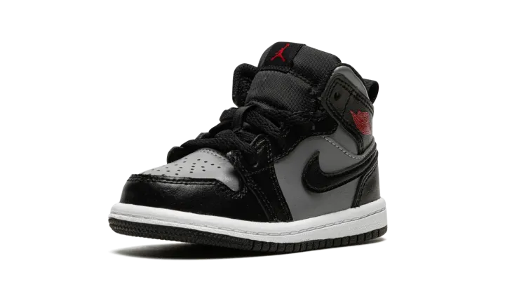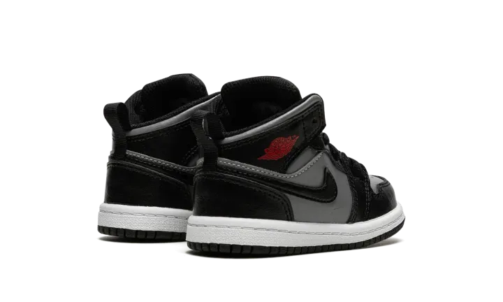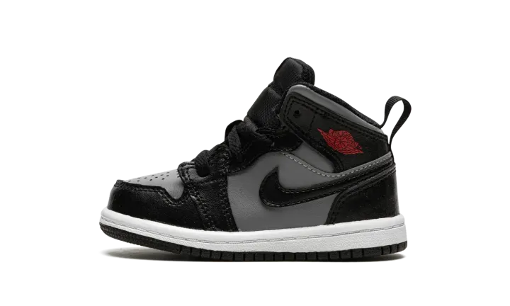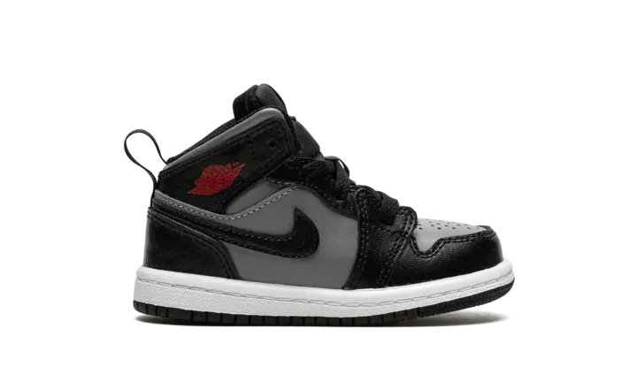 The Jordan 1 Mid TD "Shadow/Red" is the toddler sizing of Michael Jordan's first signature shoe in a mostly two-tone, black-and-grey colorway. The casual look for the Jordan 1 Mid is based on the original "Shadow" colorway from 1985, though there are several differences between the retro shoe and the modern "Shadow/Red" style. The latter features a Particle Grey leather base with contrasting black leather overlays and Swoosh branding. A Gym Red "Wings" logo is found on the collar. A fiery red Jumpman is located on the black nylon tongue tag on the black nylon tongue. A pull loop on the heel assists with on-off wearability.